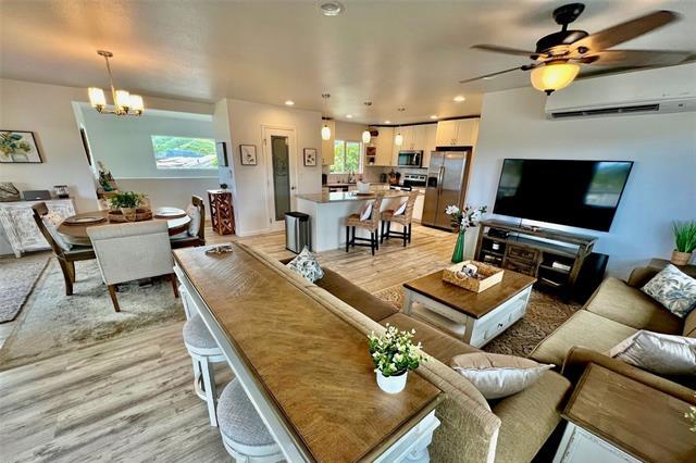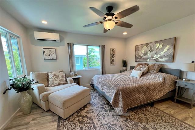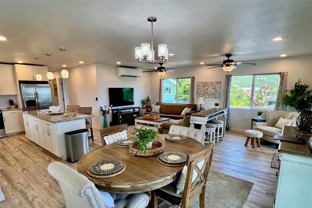 Elegant 5-year-old home offering exceptional investment potential and flexible multigenerational living. This spacious property features a two-level main home with an attached ADU, a 2-car garage, and parking for up to 9 cars. Currently operated as a 30–90 day rental. The private ADU includes a full kitchen and living/dining area—ideal for rental income or extended family. The main home offers separate living spaces on each level. Upstairs includes the primary kitchen, great room, 2 lanais, and 4 bedrooms/2 baths (one used as an office). Downstairs features a family room with dining area, kitchenette, 3 bedrooms/1 bath, and 2 small yards with a covered lanai. The ohana provides additional privacy with its own full kitchen, great room, 2 bedrooms/1 bath, and a fenced yard. All rooms offer split A/C, ceiling fans, and large windows for natural light and breezes. Three private living areas, each with separate entrances and laundry. Fully furnished, turnkey, with four years of strong rental history. Please do not disturb tenants.