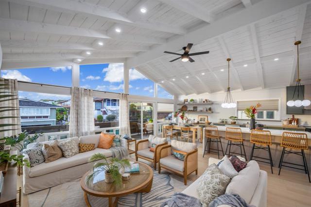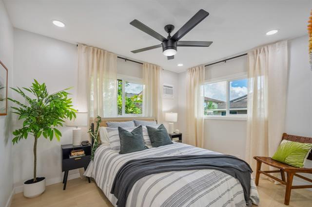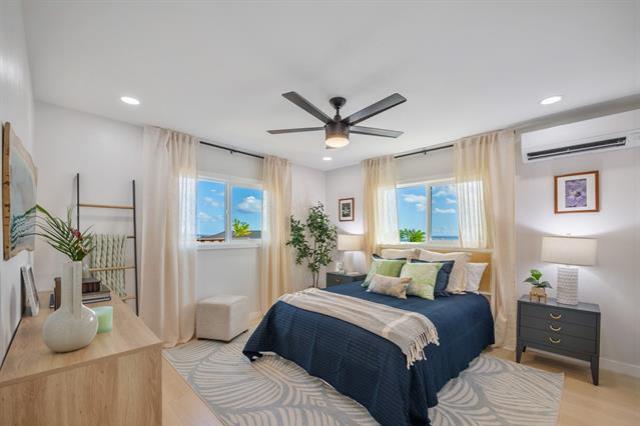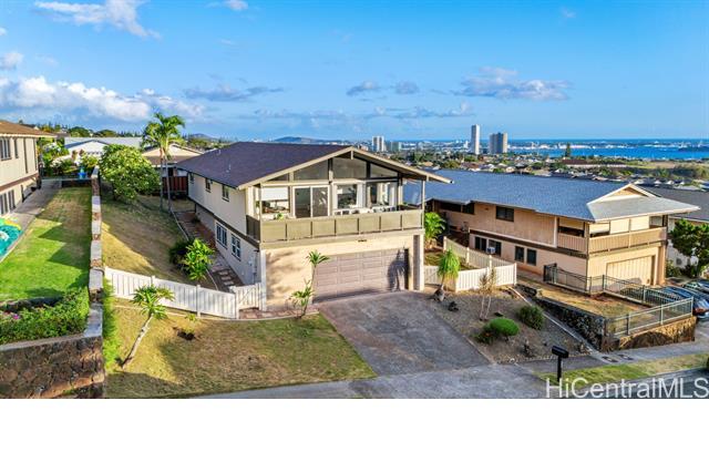 Welcome to this beautifully updated 4-bedroom, 2.5-bath home in desirable Newtown Estates. Featuring the exclusive Lanikai Maple flooring from the Mauka to Makai collection, this home offers modern comfort with island-inspired charm. Enjoy high ceilings, a spacious living area with split AC, and window units in all bedrooms. The generous kitchen is equipped with brand-new stainless steel appliances, and dual-pane windows provide energy efficiency throughout. A welcoming lanai invites seamless indoor-outdoor living, perfect for relaxing or entertaining. Take in stunning harbor views from multiple vantage points in the home. Move-in ready and thoughtfully upgraded, this is a must-see property in a prime location.