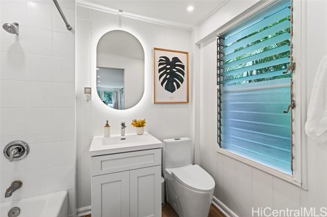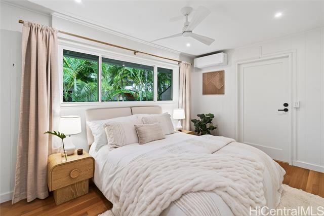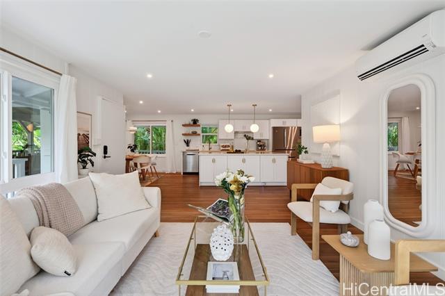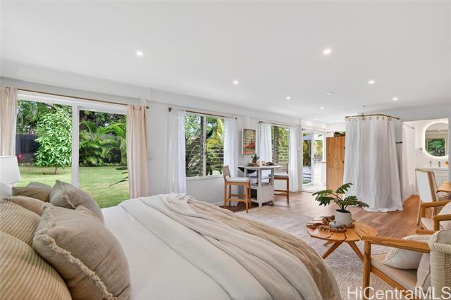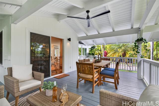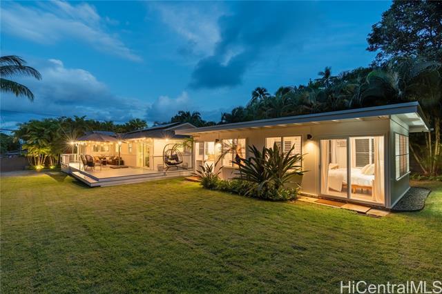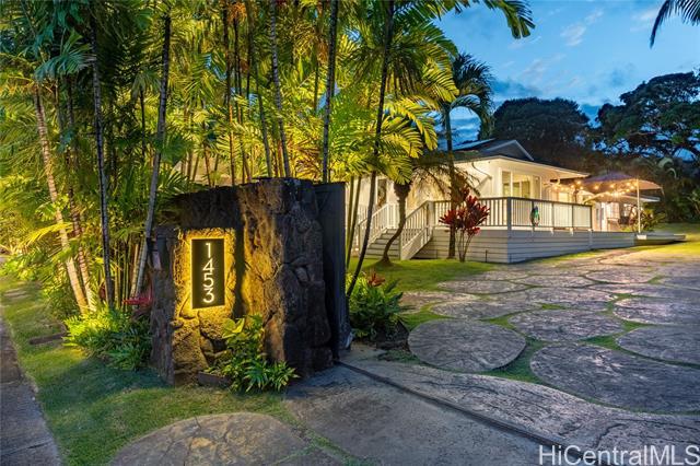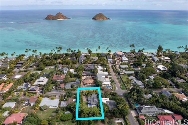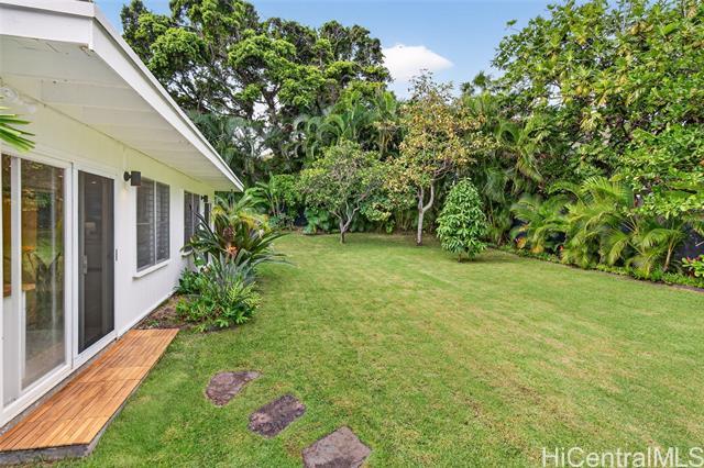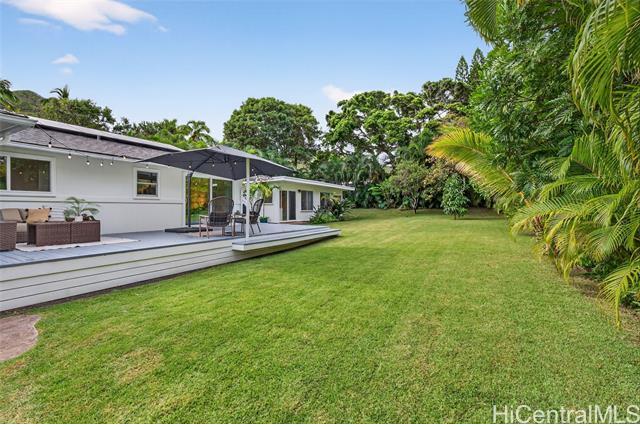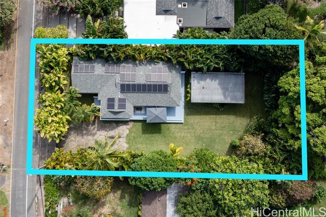 Experience the best of Lanikai—where the quiet end of the road leads to your own private paradise. This peaceful retreat sits on a generous enclosed 11,250 SF fully landscaped lot. A rock wall and private electric gate with camera security offer exceptional privacy and mature tropical grounds include a thriving avocado, mtn apple & puakenikeni. Modern upgrades elevate everyday living in the turnkey main residence (3 bed/2 bath). Fully renovated smart home w/oak hardwood floors, new kitchen and spa-like bathrooms. New doors & windows invite abundant natural light, while split AC throughout ensure year-round comfort. A wrap-around deck seamlessly connects for Hawaii indoor/outdoor living. The tucked away cottage offers gentle trade winds and lush views—ideal for guests, extended family, or flexible living options. It enjoys a kitchenette, full bath, & new W/D. Featuring 33 owned solar panels w/NET metering + Tesla charging hookup, blending island living with forward-thinking efficiency. A rare Lanikai offering combining privacy, sustainability, and refined island design—moments from one of the most celebrated beaches in the world, yet peacefully removed from it all.