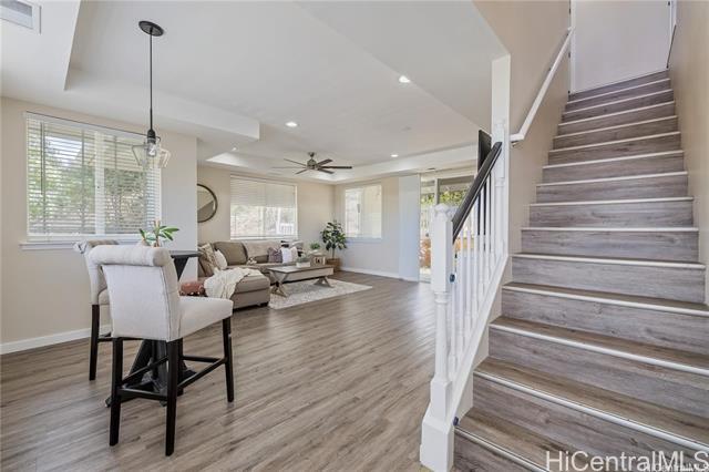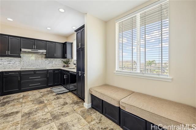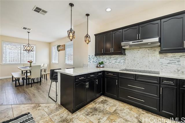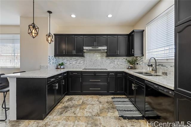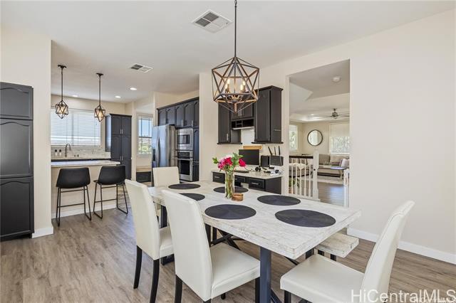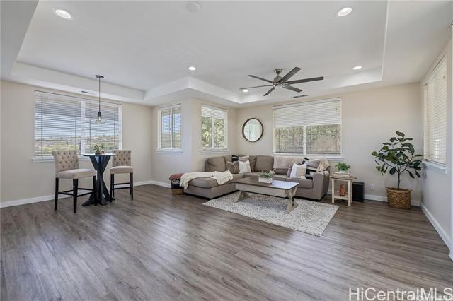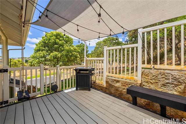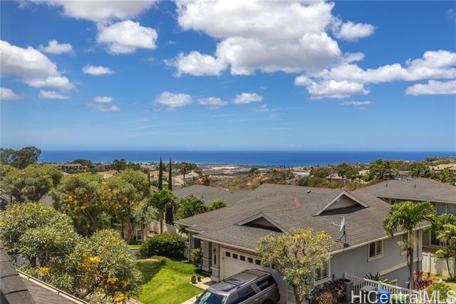 Welcome home to this beautiful modern style corner lot home in Makakilo. Stylish, comfortable & thoughtfully designed.This home offers peaceful sense of comfort & tranquility w/stunning mountain, ridge & ocean views.Featuring 4 bedrooms, 2.5 Bathrooms including one bedroom conveniently on the lower level.This layout is ideal for flexible living.The primary suite boast a walk in closet, double vanity, soaking tub & walk-in shower. The open living area is perfect for everyday living. Check out the 9 foot ceilings w/ elegant soffit ceiling designs.The home includes Central AC, solar water heater, a well appointed kitchen stainless steel built in appliances, granite countertops & black solid wood cabinetry. The home features spacious dining area, ceramic tile & luxury vinyl flooring. It has has an enclosed 2-car garage plus a driveway parking.Outside is beautiful open deck & play area with swing & slide.Just step away is a private park ideal for relaxing walks & enjoying sunset views. Conveniently located with easy freeway access & minutes from shopping centers, restaurants, movie theater,Costco and businesses. Pls. allow 48 hours notice for showings through SentriKey Showing Service.