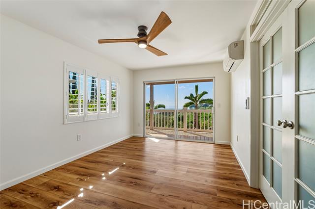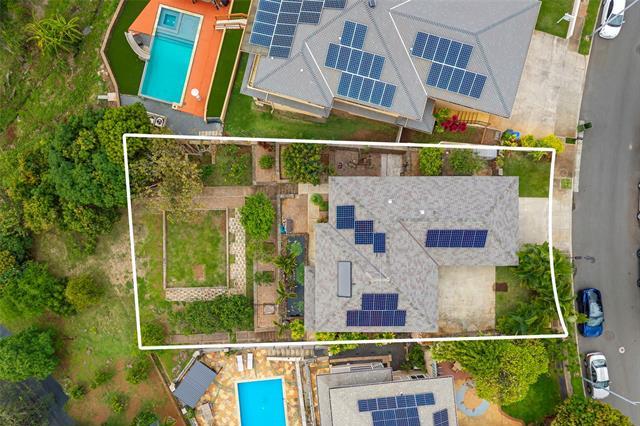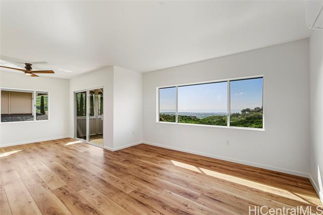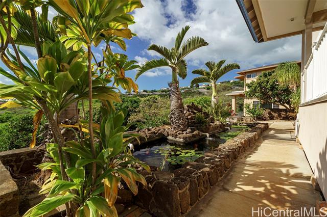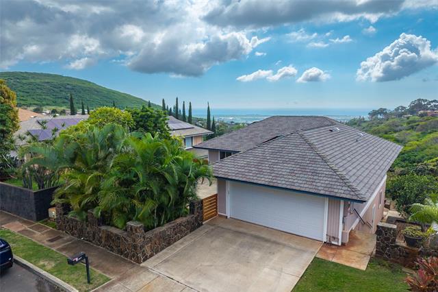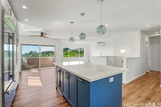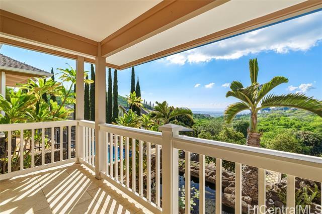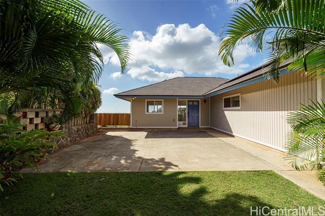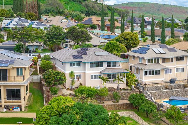 WOW, WHAT A VIEW! Breathtaking ocean vistas from every room of this 3-bedroom, 2.5-bath, perimeter lot home in Upper Makakilo. The chef’s kitchen impresses with a Sub-Zero refrigerator, massive island, outdoor-venting range, microwave, and a wine fridge. Split AC in all main rooms and bedrooms. 18-panel owned PV system and battery backup keep utility costs manageable. Enjoy the flexible bonus room as a home office, guest area, or creative space. Start your mornings on the back lanai with coffee and ocean breezes or host unforgettable dinners on the front lanai under the stars. The upper terrace features a serene koi pond above 18 fruit trees in and just beyond the backyard, including orange, mango, avocado, lime, pomegranate, pomelo, and tangerine. A gardener’s dream, the property includes a foundation already in place for a future greenhouse. Storage abounds with a garage tool area, multiple linen closets upstairs and downstairs, an under-the-stairs closet, and an impressive ~310 sq. ft. bonus storage room accessible from the side of the home. HOA $83.29/yr. VA buyers may assume the 2.375% loan with ~$886k balance. Secondary financing *might* be avail. Schedule a showing today!