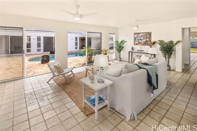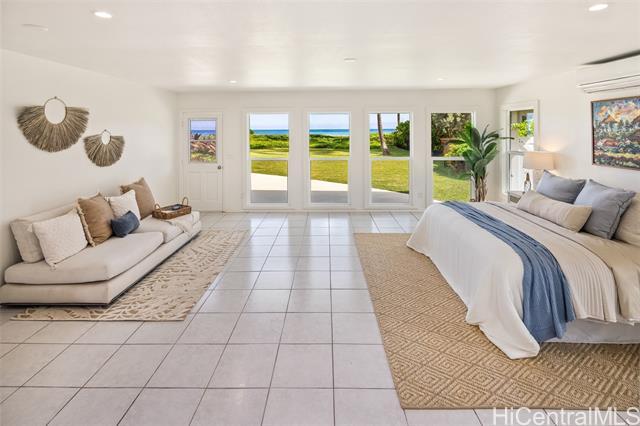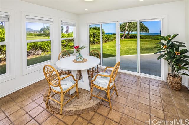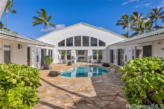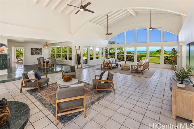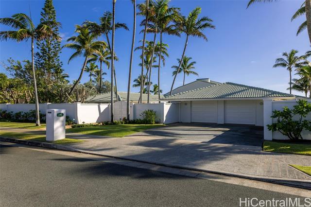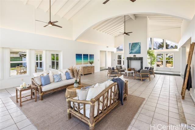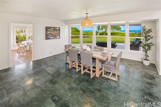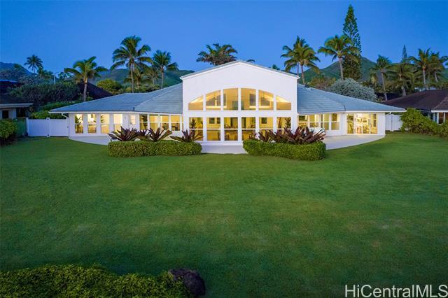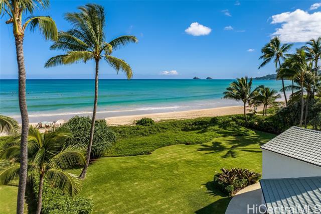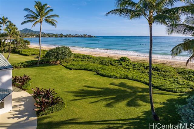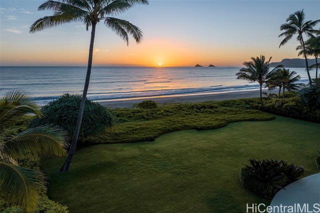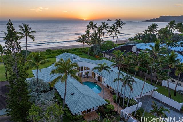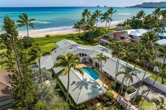 Great value in this beachfront estate in Kailua's highly sought after Kainalu Park neighborhood fronting famous Castle Beach with approx. 27,293 sq. ft. of land, an expansive oceanside lawn, and 125 linear feet of sandy beach frontage. The curb appeal is stunning, accented by tropical landscaping, outdoor lighting, and aesthetically designed front wall with double gates. With 5 bedrooms and 4.5 baths, this spacious home has 5,201 sq. ft. of interior living space that opens out to a blue tile pool and flagstone courtyard. The soaring open beam ceiling in the main living room area takes in the ocean views from the floor-to-ceiling windows. This home features 2 primary suites and two other large ensuite bedrooms. The fifth bedroom may also be used as an office/den. The main primary suite features two oversized walk-in closets and ocean views. The open kitchen recently updated with new appliances. Adjoining to the kitchen are 2 oversized walk-in pantries. Recent upgrades include complete exterior and interior paint, a newly coated roof with new solar vents, new lighting and ceiling fans, and refreshed landscaping that features a commercial grade sprinkler and irrigation system.