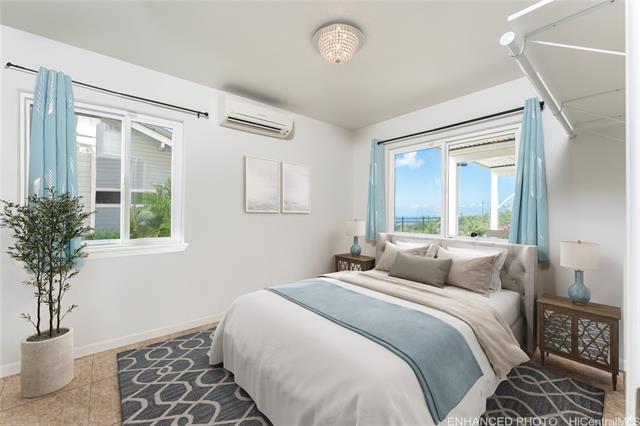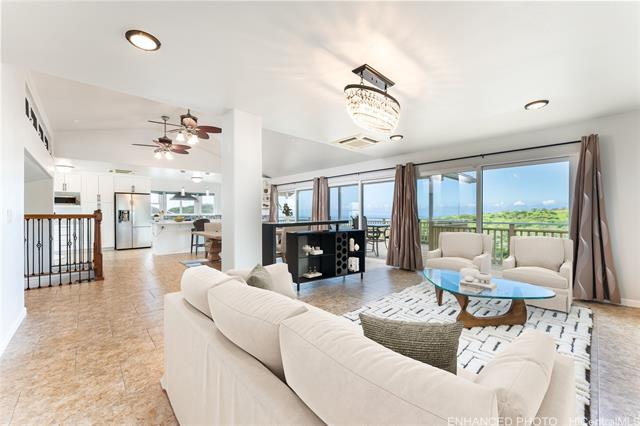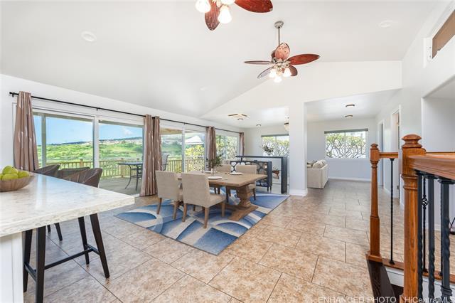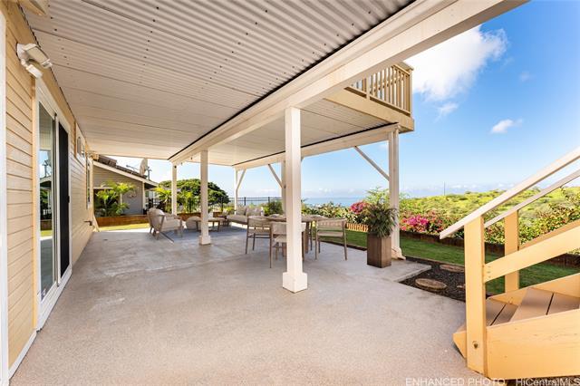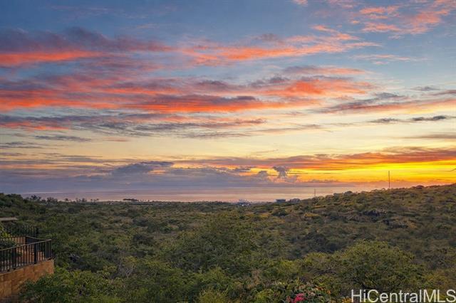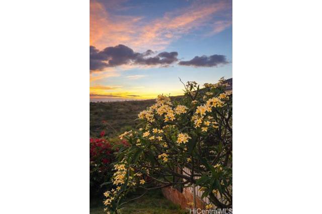 Beautifully upgraded 3bdrm, 3baths, two-story home on a rare perimeter (rim) lot in Makakilo with no rear neighbors. Enjoy panoramic west-facing views of sunsets, the ocean, coastline, and mountains. The main level features a spacious open living area that flows to a large lanai—perfect for indoor-outdoor living and entertaining in Makakilo’s cool breezes. Recent upgrades include a brand-new kitchen with new cabinetry and all-new appliances, fresh interior paint, modern finishes, and a spacious primary bedroom with a large closet. Additional features include porcelain tile flooring, split and ceiling-mounted A/C systems, and 20 leased solar PV panels with the lease paid in full. The system is on HECO Net Energy Metering (NEM), resulting in very low monthly electric costs. Enjoy multiple outdoor spaces, including a large covered main-level lanai, a lower-level patio, and a private backyard, all ideal for gatherings. This rim lot property offers the perfect blend of comfort, privacy, and breathtaking views, conveniently located minutes from Ka Makana Ali'i Mall, H-1 freeway access, restaurants, schools, bus stops and much more! (Some photos have been virtually staged/enhanced)