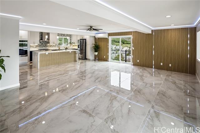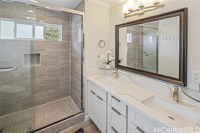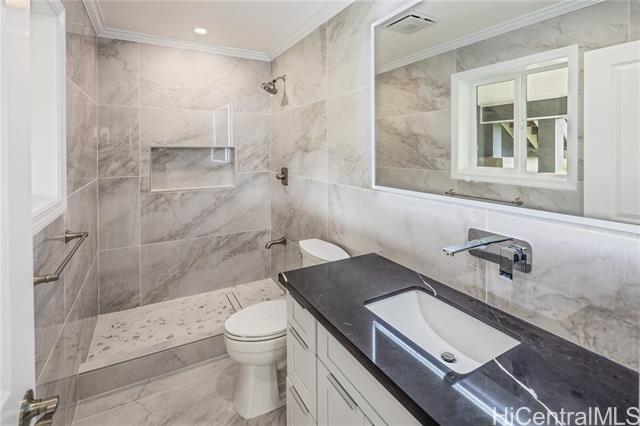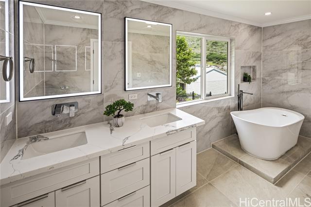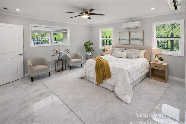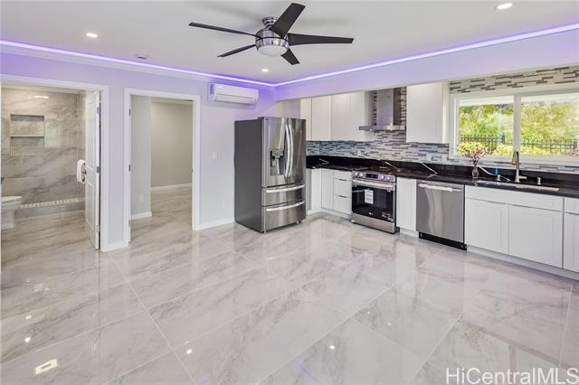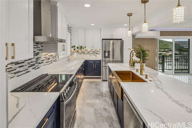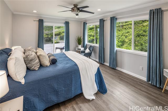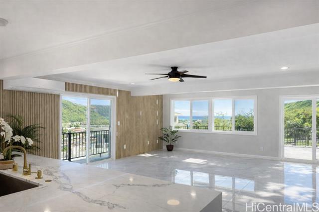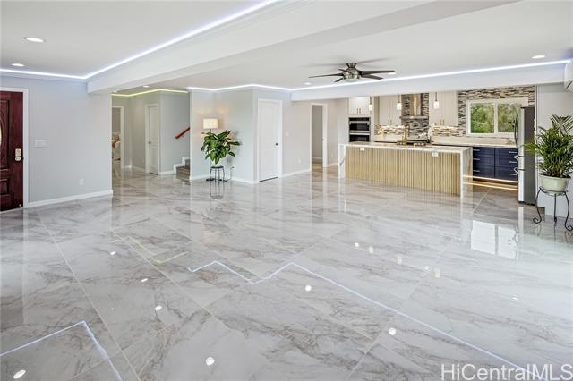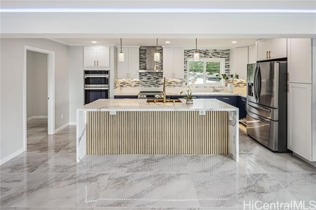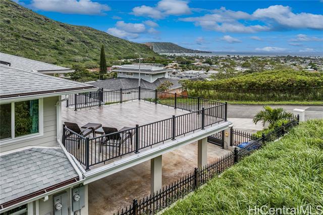 Discover this elegant & inviting 3-story turn-key residence with beautiful ocean and mountain view, thoughtfully redesigned with quality craftsmanship & modern comfort throughout. A brand-new 2BD/2BA ADU on the lower level offers exceptional privacy with its own driveway, separate electric meter, full kitchen, laundry, and water heater—ideal for extended family or flexible living arrangements. The main home was remodeled and expanded in 2026, featuring a bright & spacious open-concept kitchen and living area filled with natural light, refreshing island breezes, and beautiful lighting. The new kitchen is appointed with granite countertops, soft-close cabinetry, and quality finishes, blending style with everyday functionality. The main level has a luxurious primary suite with a walk-in closet, freestanding soaking tub, separate shower, and a serene, spa-like ambiance. The upper level offers 4 beds and 2 baths, enhanced by ocean and mountain views. Enjoy seamless indoor-outdoor living from the expansive lanai, perfect for relaxing or entertaining. Split A/C throughout ensures year-round comfort, while thoughtful upgrades and tasteful finishes create a refined yet welcoming atmosphere.