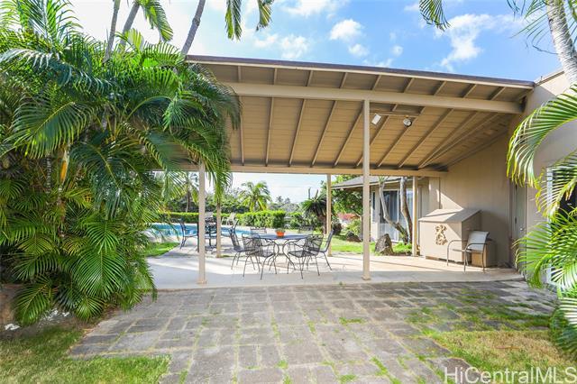 This beautiful 16,795 sqft Aina Haina estate is located at the base of Hawaii Loa Ridge overlooking the Pacific Ocean with stunning Koko Head to Diamond Head views. The classic architecture is designed around a courtyard and pool area for perfect Hawaiian style indoor/outdoor living. Vaulted ceiling living room comes with a fire place and opens on to the garden and covered lanai. The 5 bedrooms and 2.5 baths wrap around the courtyard, each room with a separate entrance to the outside providing full privacy. The long driveway leads up to a private 4-car outside parking area and a separate detached 840 sqft 2-car garage and workshop space.