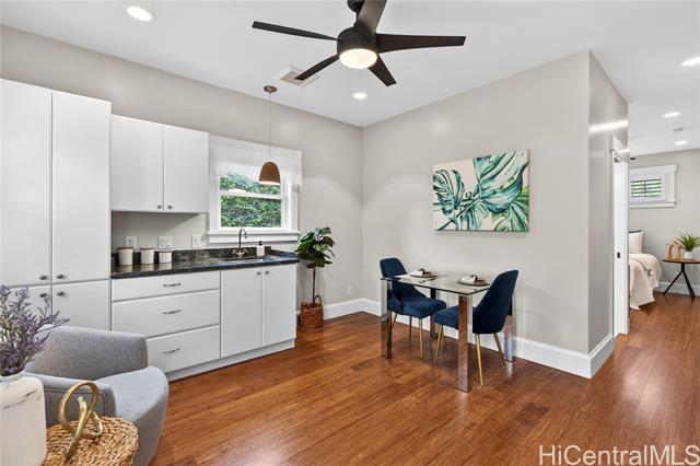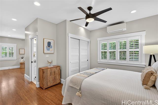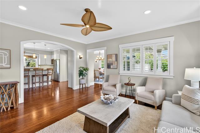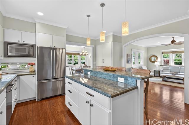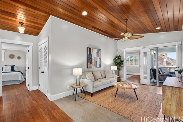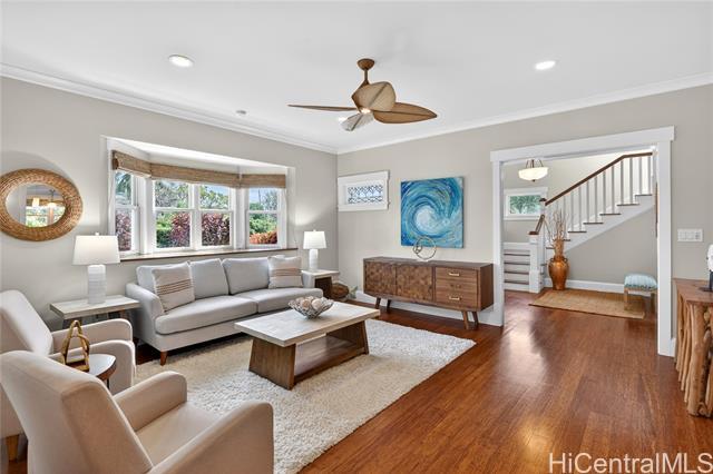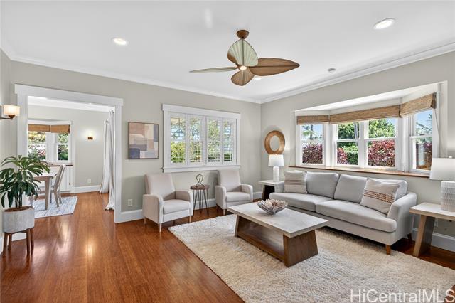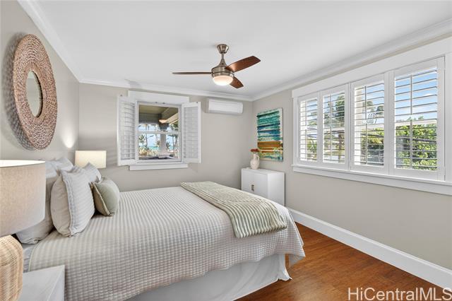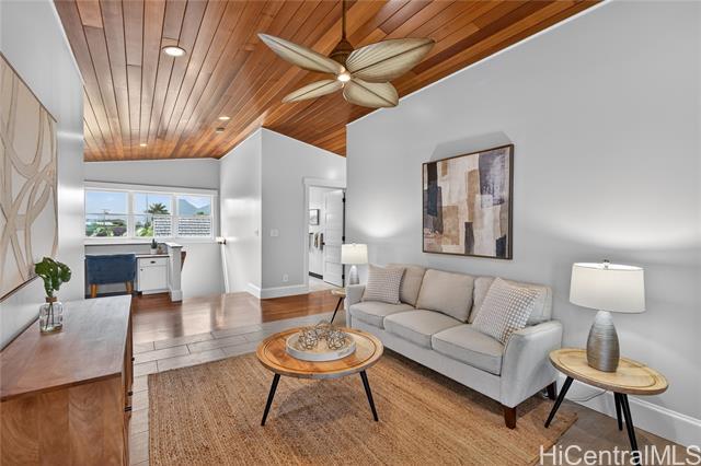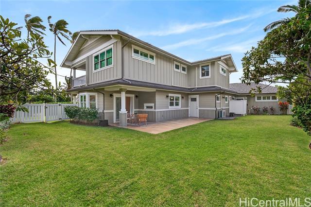 Tucked along a quiet lane in coveted Beachside Kalaheo, this LEED Gold–certified residence captures a rare balance of timeless island architecture and forward-thinking design. Built in 2014 by Mokulua High Performance Builders, the 5-bedroom, 3.5-bath home reflects a commitment to quality, comfort, and sustainability—showcasing rich hardwood floors, detailed millwork, and soaring 9-foot ceilings that create warm, understated elegance. Sunlight and tradewinds flow through open living spaces anchored by a beautifully appointed kitchen, while upstairs ocean views frame a serene primary retreat and flexible additional bedrooms. A semi-detached 1BR/1BA cottage with private entrance adds versatility for guests or extended family. Owned photovoltaic panels with Tesla Powerwall support efficient island living. Mere steps from Kailua Beach, where morning swims and sandy feet at sunset become part of daily life, this newer custom home offers a rare opportunity to experience refined coastal living.