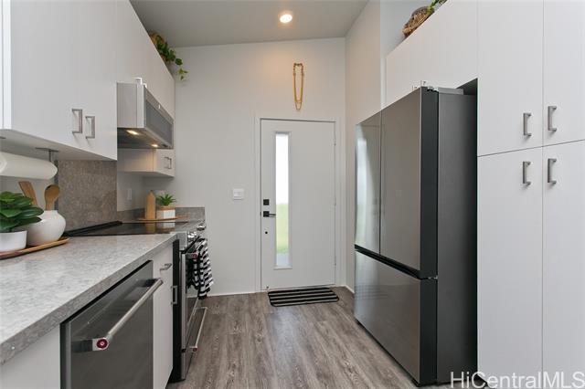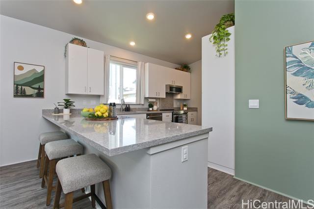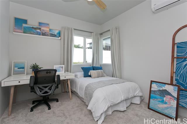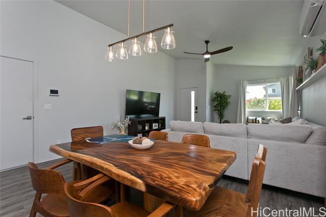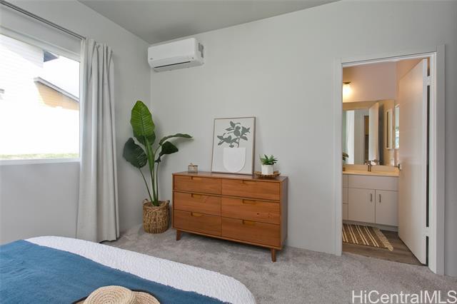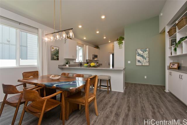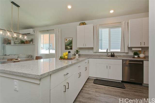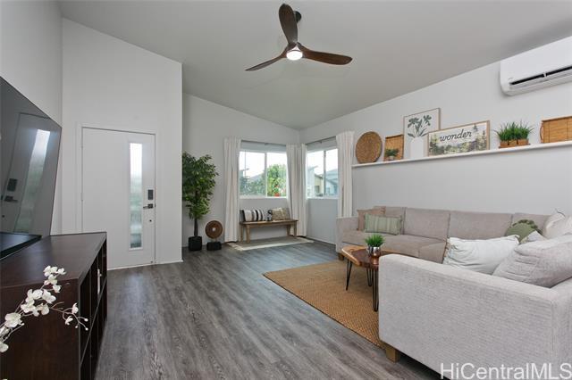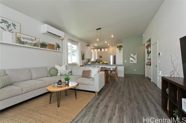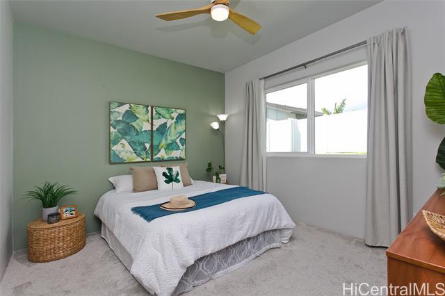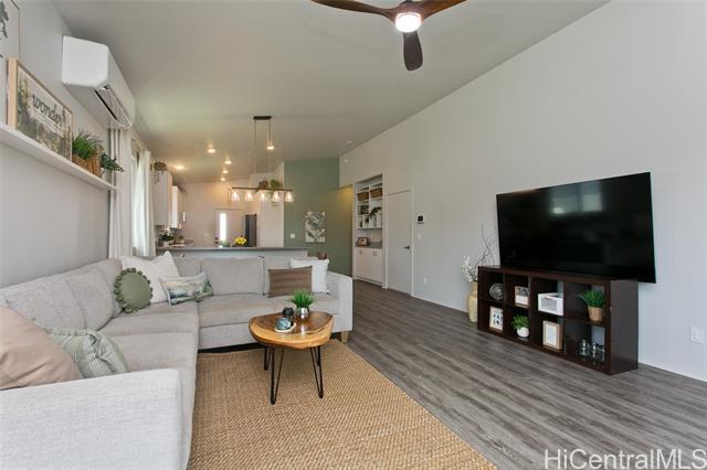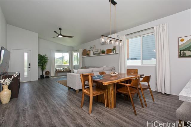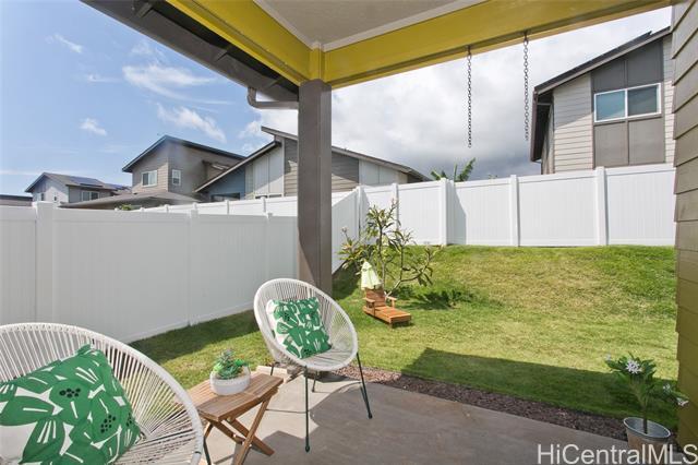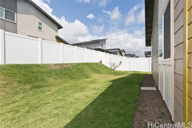 Comfort, tranquility & convenience awaits in this newly-built single-level home in the popular neighborhood of Ikena-Hoopili! Enter into the expansive living & dining room highlighted by vaulted ceilings and a generous kitchen island with seating seamlessly transitioning into the stylish and functional kitchen. The primary bedroom offers a walk-in closet while the en-suite bath boasts a walk-in shower & dual sinks. Enjoy the benefits of a single-family detached home with no maintenance fees, generous front & back yards, a large 2-car garage equipped with full size washer/dryer & solar water heater and extra parking on the driveway & street! This home has been upgraded with neutral-colored black-out curtains & sheer liners, wall art shelving, coastal green wall paint to let the outdoors in, Kitchen-Aid appliances & expanded grass in the backyard. Split system AC units in every room & smart-home equipped! Ikena will be walking distance to the future elementary & middle schools. As a Hoopili resident, enjoy access to the SOHO Community Center pool, rec areas & more!