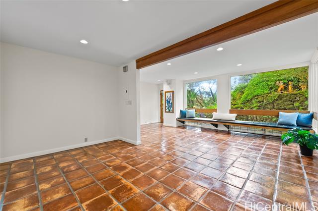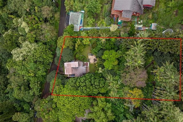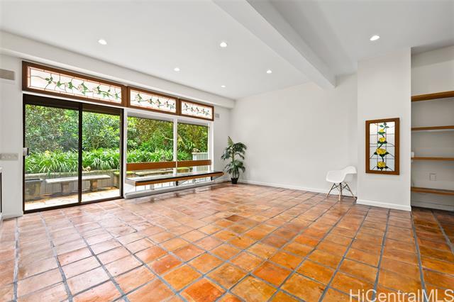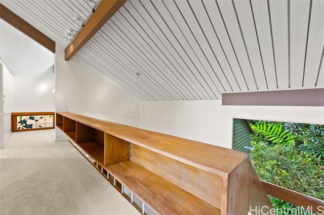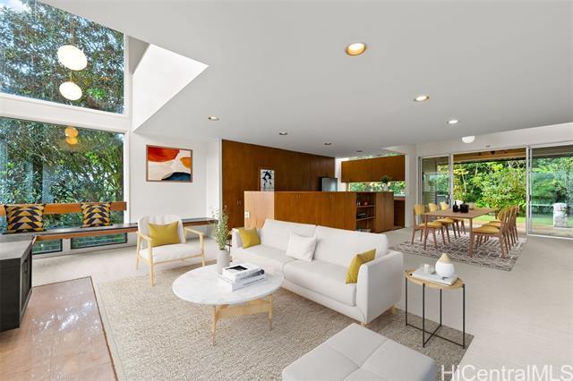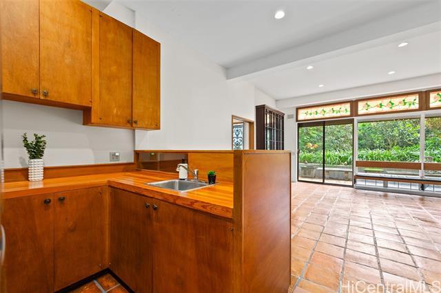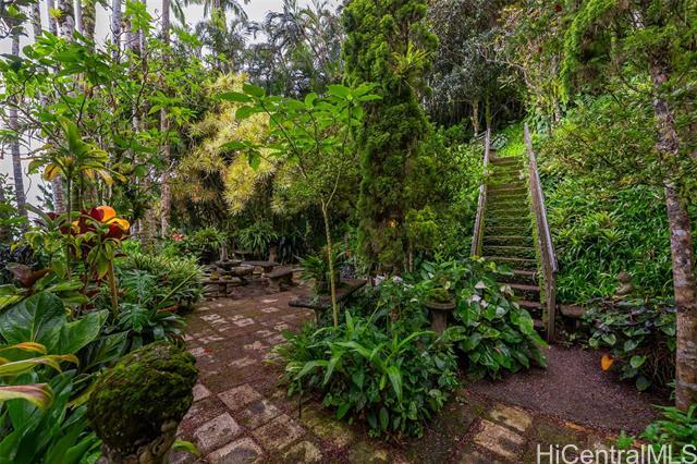 Perched above the city in a serene, forested setting, this rare mid-century modern retreat is surrounded by one of the most extraordinary private gardens on the island. Featured in Honolulu Magazine and on TV, this private home was designed by noted architect Charles Chamberland and offers 4 bedrooms, 3 baths, and approximately 3,000 sqft of interior living space with a flexible multigenerational layout. Freshly painted with new carpet, the home features soaring ceilings, expansive windows, and an open concept design that brings the outdoors in. Kitchen includes marble flooring, mahogany cabinetry, and butcher block counters. Loft style primary suite. First-level safe room with hurricane shutters. Set on lush, terraced grounds with more than 100 magnolia trees, the mountainside garden is masterfully curated with 7 sitting areas, 4 winding trails, 2 waterfalls, ponds and a collection of fountains surrounded by vibrant staghorn ferns, anthuriums, orchids, bromeliads, and blooming angel trumpets. A scenic landing with peekaboo ocean views offers a peaceful place to unwind, with 190 steps leading to the summit. An unforgettable experience! 5 photos have been enhanced. Sold "as is.".