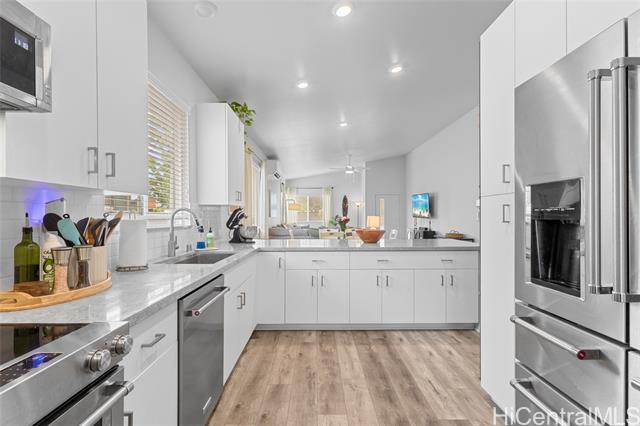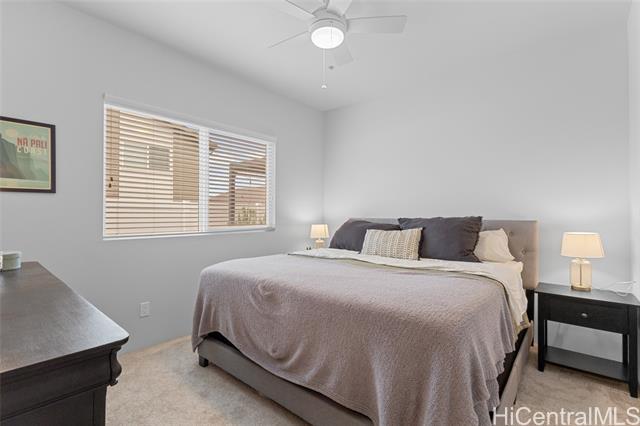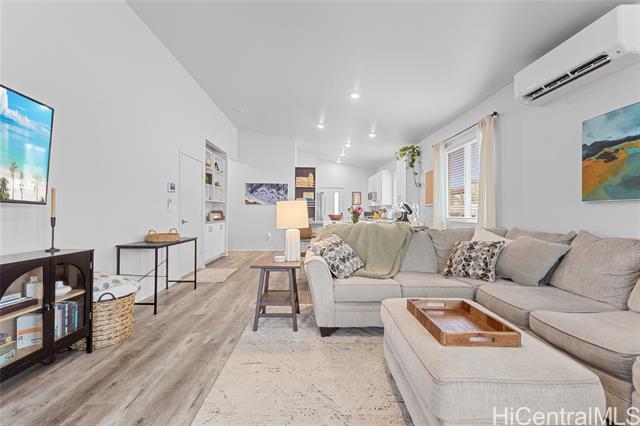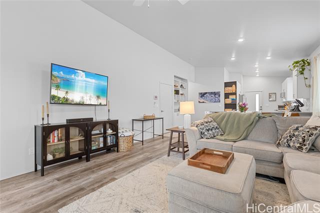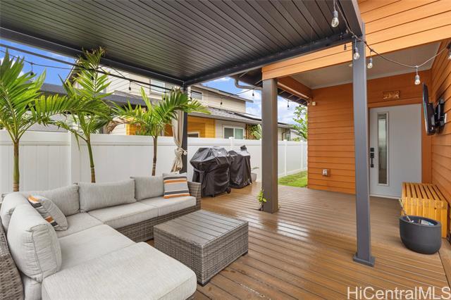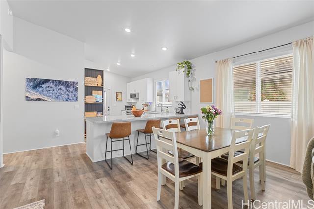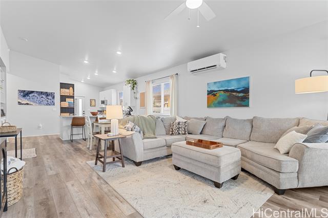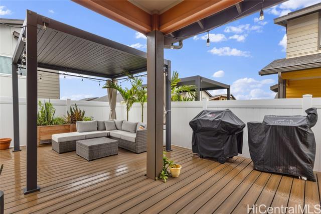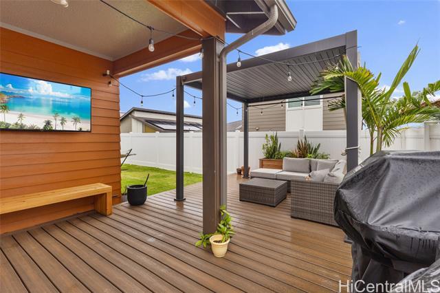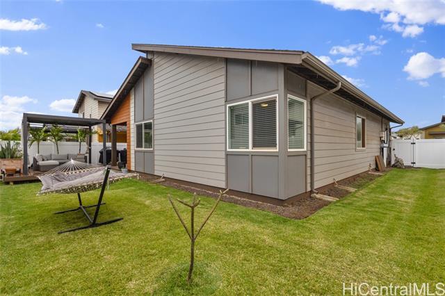 Welcome to Hoopili! This 3 bed 2 bathroom home is exactly what you have been looking for and it checks all the boxes! The modern open concept living space with huge vaulted ceilings is filled with natural light and character which makes it feel like home. The kitchen includes plenty of storage space and a beautiful new cutting board wall. The three bedrooms are spacious and include split AC systems. The primary bedroom closet includes plenty of space and built-ins. Step outside into an absolute oasis with a pergola, deck, and ample yard space. Host plenty of family and friends outside for a BBQ or inside the home with all of the space. The 2 car garage has a laundry sink and a washer and dryer and still allows plenty of space. The home includes a security system as well as 18 leased PV panels and 1 battery. Conveniently located in one of the most desirable neighborhoods in the Ewa Beach/Kapolei area, you are literally minutes away from dining, golf courses, playgrounds, and you have access to Farrington Highway and H-1 for an easy commute. Schedule a showing to come see it before it's gone!