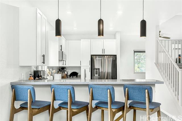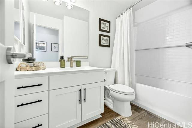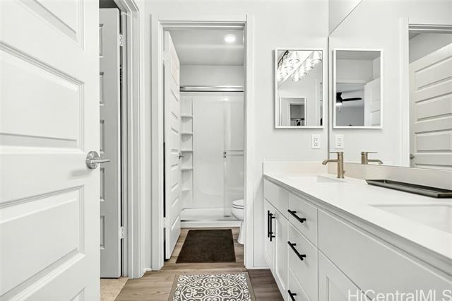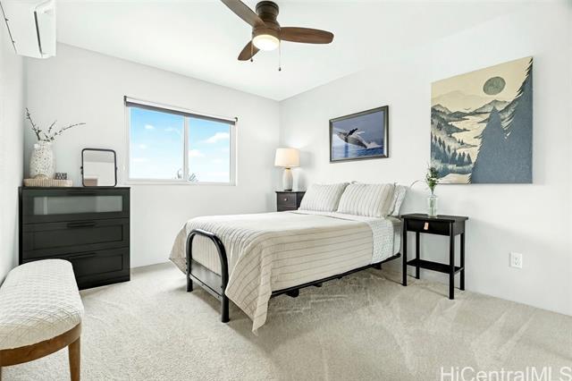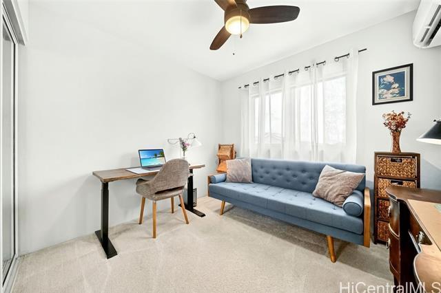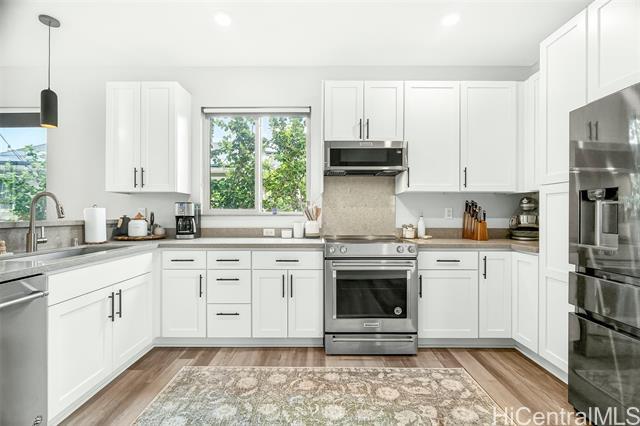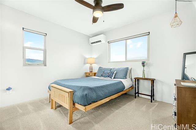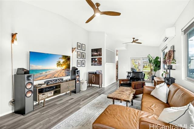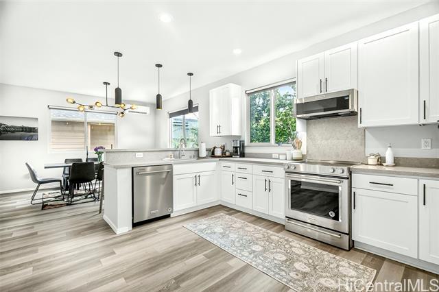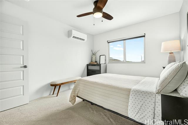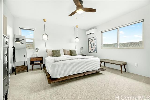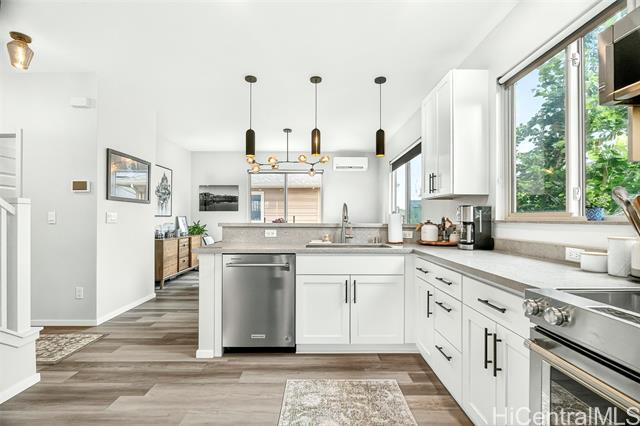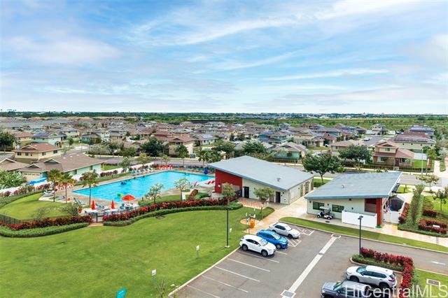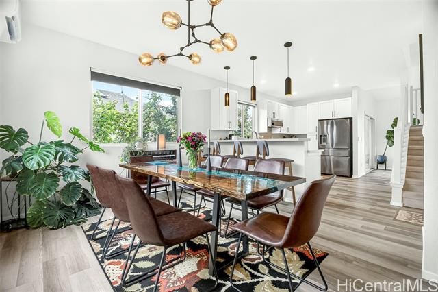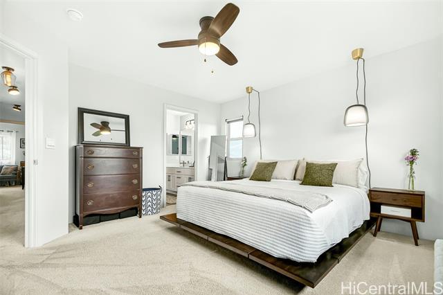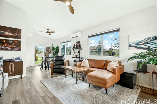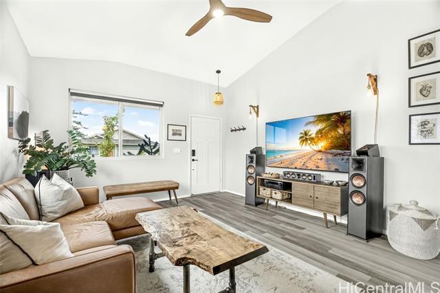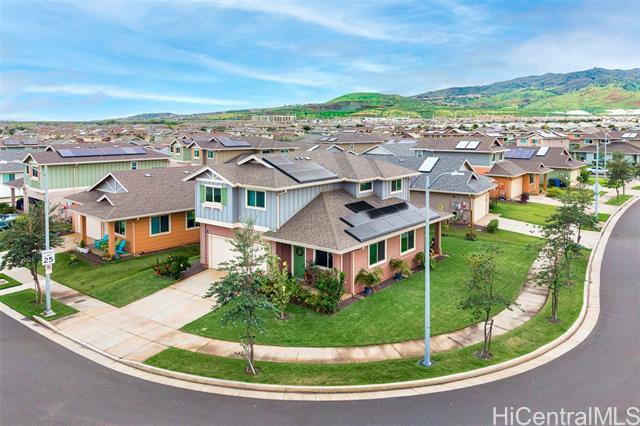 Beautiful 4-bedroom, 2.5-bath home offering modern comfort and energy efficiency. Walk into the bright and open living space with soaring ceilings, luxury vinyl plank flooring, and built-in surround sound wiring already in place. Perfect for entertaining guests or a movie night in. Flow right into the kitchen where you'll find beautiful quartz counters, stainless steel appliances, and ample seating space at the breakfast bar. Upgraded guest bathroom downstairs, and modern lighting fixtures throughout the whole home. Upstairs, you'll find 4 well-appointed bedrooms with the primary bedroom featuring an en-suite bathroom with dual vanity and walk-in closet. Split ACs in every room with 24 OWNED solar panels with battery backup make this home extremely energy efficient! Whole home water softener system too! Situated on a corner lot with a beautiful landscaped yard with raised garden beds and overhead ambient lighting, making for a true oasis! Located in Ho'opili, residents enjoy access to the community pool, parks, bike paths, and convenient proximity to shopping, dining, H1, and the new rail station. VA assumption available to eligible VA buyers with a 2.25% interest rate!
