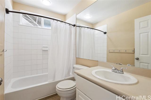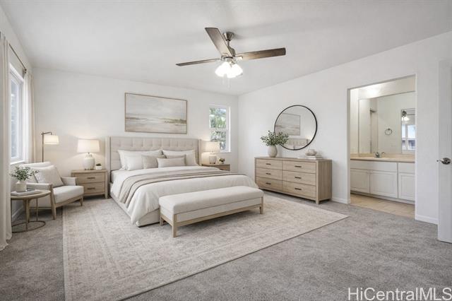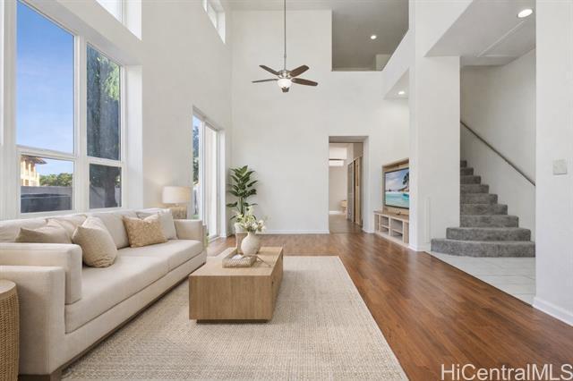 Rare bidding opportunity in Kapolei's sought-after Iwalani community. This 4-bedroom, 2.5-bathroom single-family home features nearly 1,930 sqft of living space with dramatic high ceilings in the main living area, making it one of the largest floor plans in the neighborhood. An assumable VA loan at 1.75% offers qualified buyers a rare and significant financial advantage at a fraction of today's rates. All bedrooms and full baths located upstairs for privacy with an open main level perfect for daily living and gathering. Situated on an oversized 4,436 sqft lot with a fully fenced backyard ideal for pets and kids, an attached 2-car garage, tile roof, Mediterranean-style architecture, and 19 owned solar PV panels to offset electricity costs. Easily access Villages of Kapolei Community Pool, walking distance to Kapolei Elementary, Middle, and High Schools and minutes from Ka Makana Ali'i Shopping Mall, Costco, West Oahu beaches, and H-1 freeway access. Don't miss your chance to bid have your agent see MLS Agent Remarks for auction terms and details. There will be no private or separate showings. Images are digitally enhanced