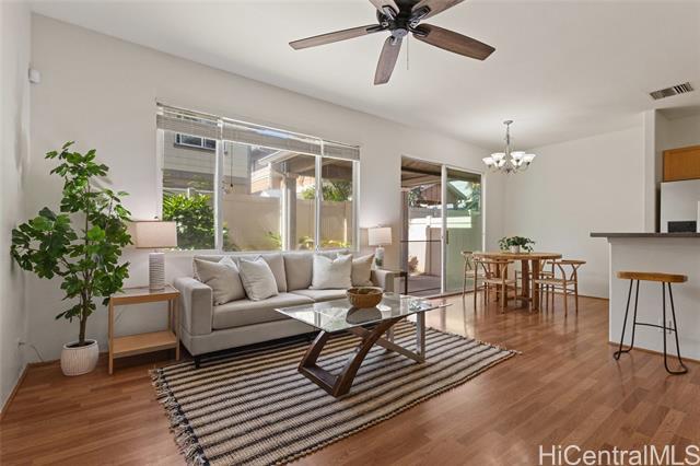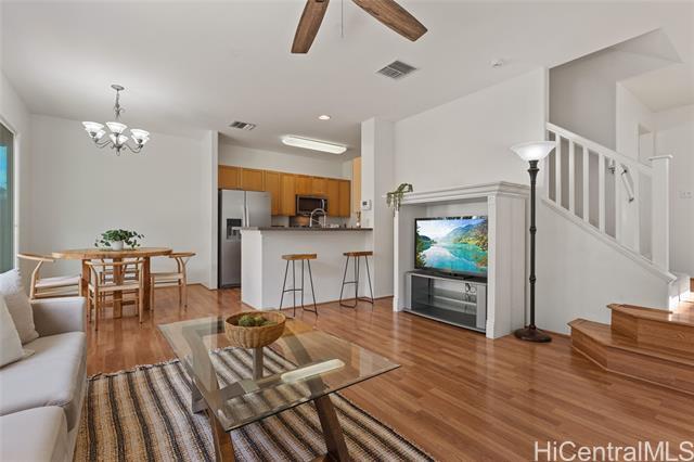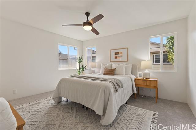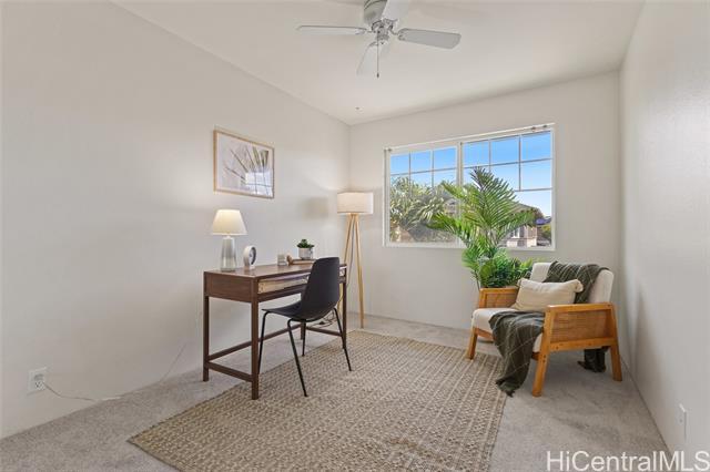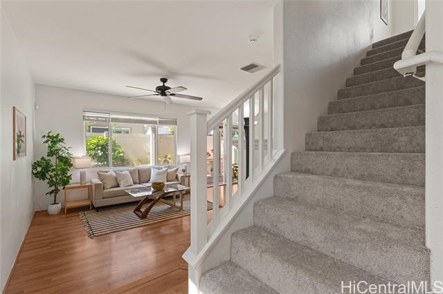 Welcome to this well-maintained 4-bedroom, 2.5-bath home at 91-2288 Kanela Street in Ewa Beach, offering over 1,500 square feet of comfortable living space. This home features an open layout, a 2-car enclosed garage, and parking for 2 additional vehicles on the driveway pad for added flexibility. The fully fenced yard is perfect for pets, entertaining, or relaxing outdoors. Upstairs, you'll find brand-new carpeting providing a quiet, comfortable feel and a cozy retreat. The home also includes numerous recent upgrades, including a brand-new kitchen range/stove, microwave, dishwasher, and kitchen sink, along with a refrigerator that is only one year old and a brand-new water heater—providing peace of mind and true move-in readiness. Stay cool year-round with central air conditioning and enjoy living in a walkable community just minutes from shopping, dining, parks, and schools. Residents also benefit from access to a community pool and recreation areas. The maintenance fee includes water, sewer, common area landscaping, recreation area care, and 100% hurricane insurance coverage, offering added value for homeowners.