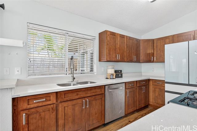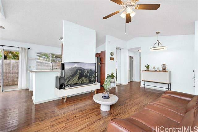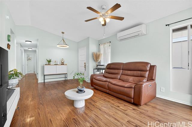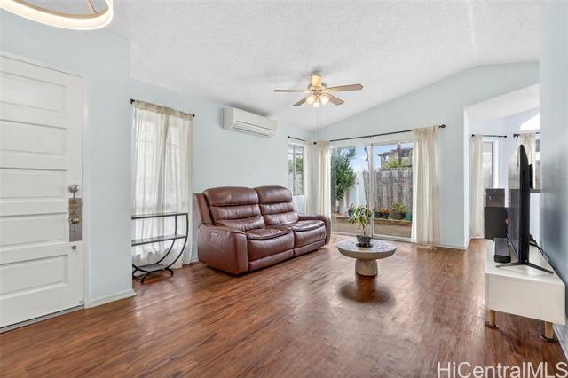 This could be your single-level dream home in Ewa Beach. Featuring an open-concept layout with vaulted ceilings and laminate wood flooring throughout, this home offers both comfort and style. Enjoy the 14 leased photovoltaic panels ($176/month), helping offset electricity costs from day one. The updated kitchen comes equipped with an upgraded refrigerator, dishwasher, stove, and microwave hood, while the beautifully renovated bathroom showcases modern, quality finishes. Stay cool year-round with split AC units in every room and a ceiling fan for added comfort. Enjoy the convenience of being just minutes from Geiger Park, Foodland, Ka Makana Ali‘i, The Kroc Center, Laulani Village Shopping Center, Wai Kai and White Plains Beach. This home is move-in ready and ready for its next chapter.