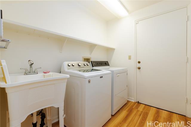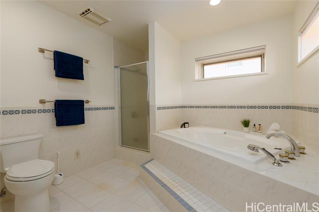 A Rare One-of-a-Kind Custom Home in Makakilo-Palehua Heights! This beautifully maintained and thoughtfully upgraded 3-bedroom, 3-bath residence offers comfort and flexibility, with cool Makakilo breezes enjoyed year-round. Designed with multigenerational living in mind, the main level features two spacious bedrooms, each with its own full bath. Perfect for extended family, guests, or a home office setup. Upstairs, the private primary suite serves as a relaxing retreat with a spa-inspired bathroom, complete with a soaking tub, separate shower, and generous walk-in closet. The fully fenced backyard provides an inviting space for entertaining, outdoor dining, or simply enjoying your own private outdoor oasis. Recent upgrades include fresh interior and exterior paint, refinished kitchen cabinetry, new oven, cooktop, and range hood, refinished bathroom counters and tubs, new luxury vinyl plank flooring throughout, and newly replaced split A/C systems throughout, offering comfort and peace of mind. Conveniently located near Kapolei’s shopping, dining, schools, parks, and freeway access, this home blends island living with everyday convenience.