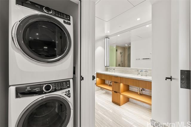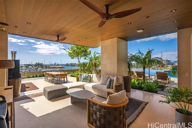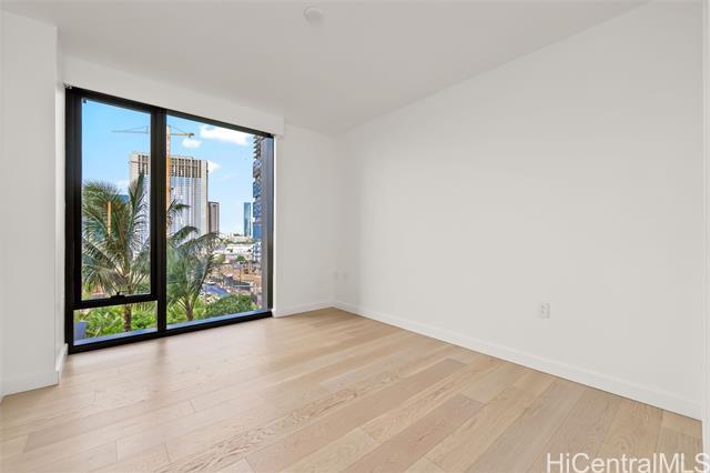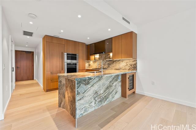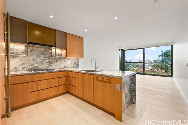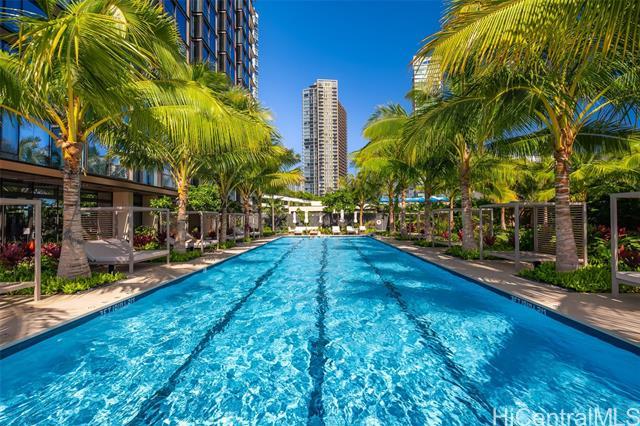 Luxury one bedroom residence at Victoria Place, the newest front row building in Ward Village. This beautifully designed home showcases ocean, harbor, park and sunset views. High end finishes include: Studio Becker cabinets, Wolf and Subzero appliances, gas stove, wine fridge and Electrolux washer/dryer. Wood flooring throughout with natural stone counter and tiles. Upgrades include motorized shades and a custom closet system. Enjoy resort-style amenities including three swimming pools, Lauhala Pool House for private gatherings, spa with hot tub, cold plunge, steam and sauna rooms, private dining, chef's kitchen, wine cave, theater, meeting rooms, barbecue pavilions, and guest suites. Experience the best of Kaka‘ako living.