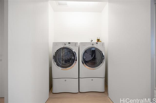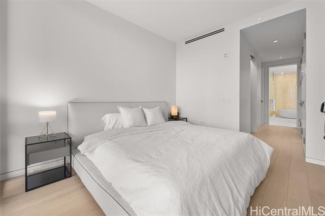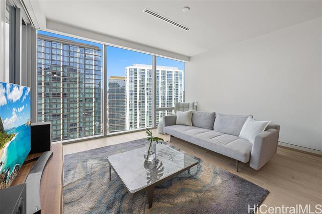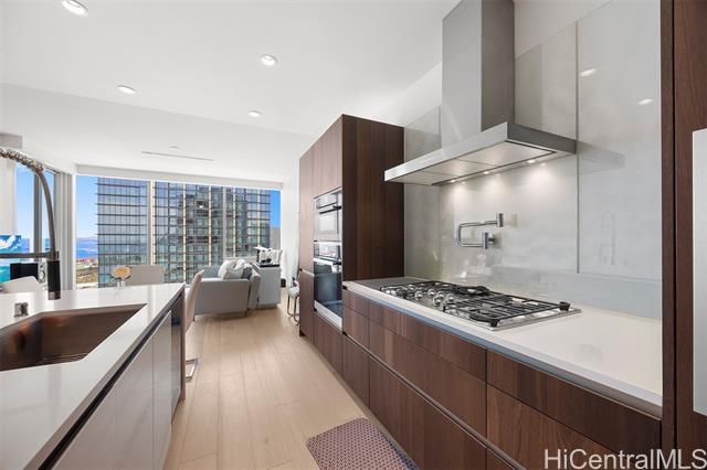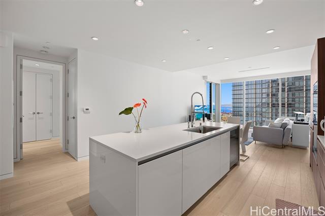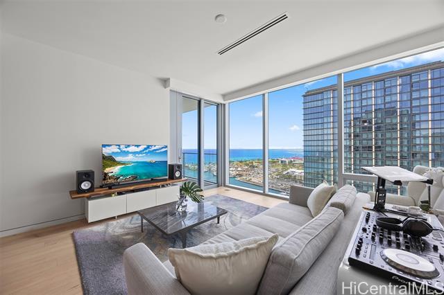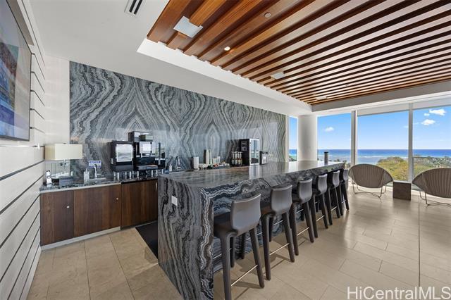 Now available — a rare high-floor, pristine one-bedroom residence with two full bathrooms at the prestigious Waiea. Offering 1,139 sq. ft. of interior living space plus a 69 sq. ft. lanai, this spacious home features soaring ceilings, elegant wood and stone flooring, European cabinetry, a full-sized Electrolux washer and dryer, and a chef’s kitchen equipped with premium Miele appliances and a wine refrigerator. The bedroom opens to a private lanai and includes a walk-in closet with a custom closet system, along with additional closets providing generous storage. The spa-inspired bathroom features a freestanding soaking tub, onyx walls, double vanities, and a rain shower. This luxury residence is offered fully furnished with high-end Italian designer furniture. Enjoy breathtaking views of the ocean, sunset, harbor, mountains, and city skyline. Residents enjoy world-class concierge service and exceptional resort-style amenities including valet service, fitness center, BBQ pavilion, theater, golf simulator, party rooms with kitchens, and sunset bar. Ideally located near Ala Moana Beach Park, Whole Foods Market, and the vibrant shops and restaurants of Ward Village.
