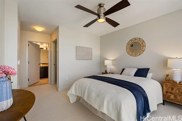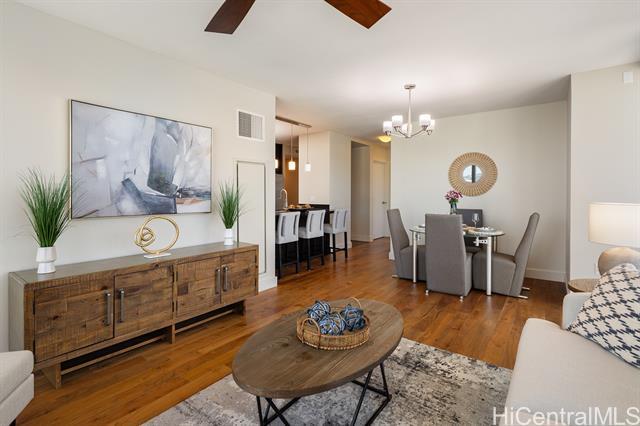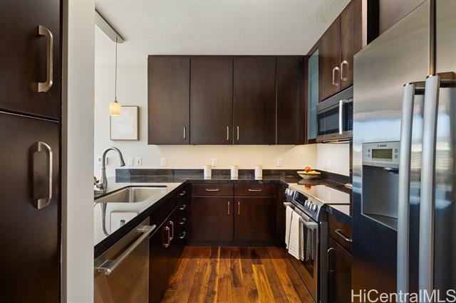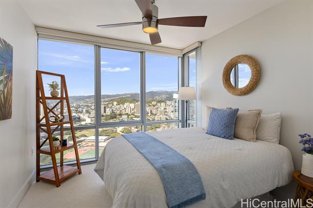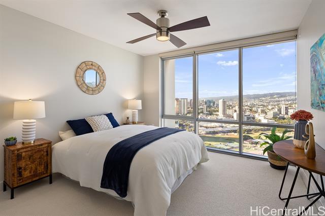 Experience refined urban living in this spacious 2-bedroom, 2-bathroom residence at the highly desirable Waihonua in the heart of Kakaako. Located on one of three penthouse floors, this corner end unit features floor-to-ceiling windows that flood the unit w/ natural light and showcase stunning city skyline & mountains views. Freshly painted w/ new carpeting in the bedrooms, the thoughtfully designed interior includes hardwood flooring in the living areas, and a wonderful kitchen w/ Bosch and Thermador stainless steel appliances. The primary bedroom has a walk-in closet and ensuite bath w/ a dual vanity. Two conveniently located 3rd flr covered parking stalls & storage. Waihonua residents enjoy an impressive array of resort-style amenities, including a large infinity-edge pool w/ poolside cabanas, jacuzzi, BBQ pavilions, a modern fitness center w/ yoga room, private movie theater, club room w/ full kitchen, and 2 visitor guest suites. The gated garage includes EV charging stations & bike/board storage. This pet-friendly bldg is perfectly located between Ward Village & Ala Moana Center, providing unmatched walkable access to world-class dining, shopping, & Ala Moana Beach Park.
