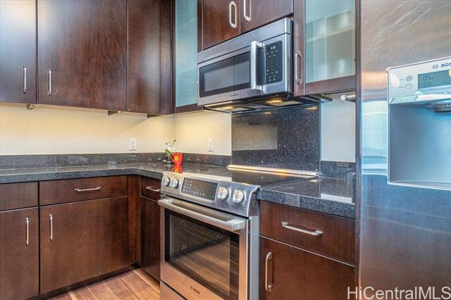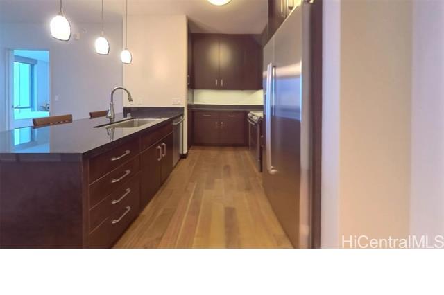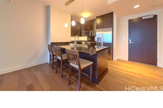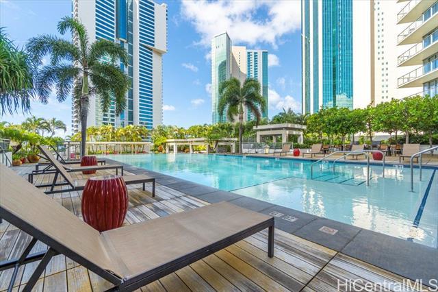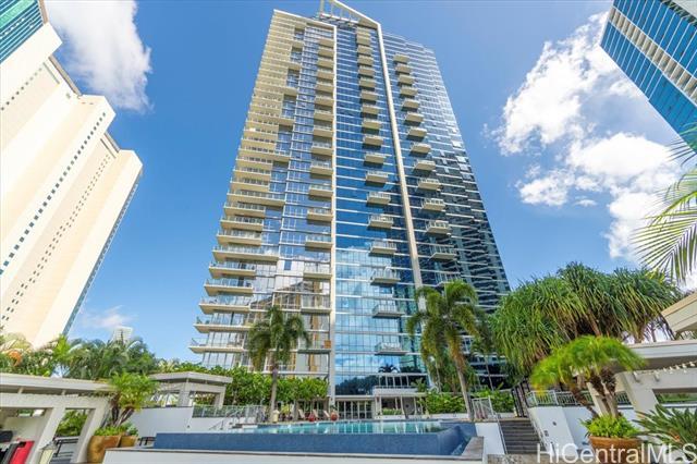 Presenting an exquisite 2-bedroom residence at Waihonua, featuring a custom-designed layout and a 64 sq. ft. balcony that seamlessly connects indoor and outdoor living—creating a spacious ambiance ideal for both relaxation and productivity. This residence offers breathtaking views of Magic Island, Ala Moana Beach Park, and the ocean. Thoughtfully upgraded throughout, it features luxurious Brazilian hardwood flooring, a sophisticated closet system, elegant light fixtures, electric shades, and more—epitomizing modern elegance and meticulous attention to detail. Conveniently located near Ala Moana Shopping Center, Ala Moana Beach Park, and Ward Village, the home provides easy access to premier shopping, dining, and entertainment. Enjoy resort-style amenities, including an infinity pool, hot tub, BBQ pavilions, a party room with a full kitchen, movie theater, fitness center, yoga room, two guest suites, and electric vehicle charging stations.
