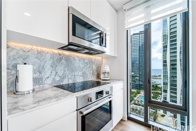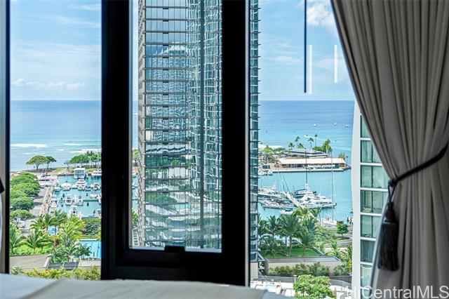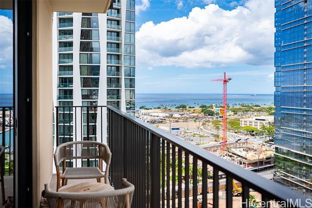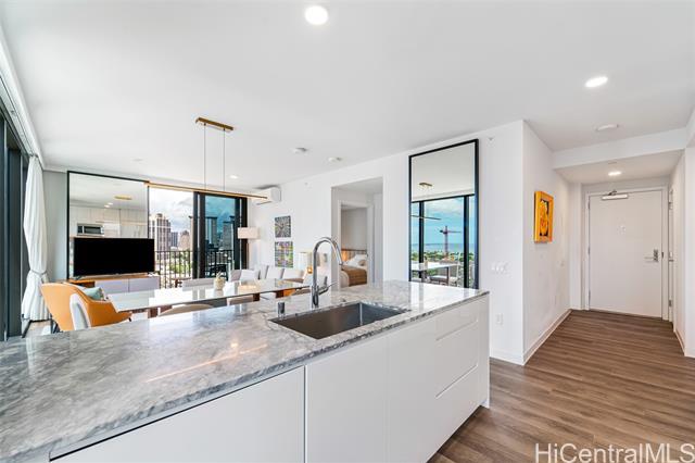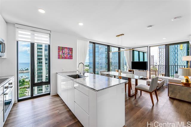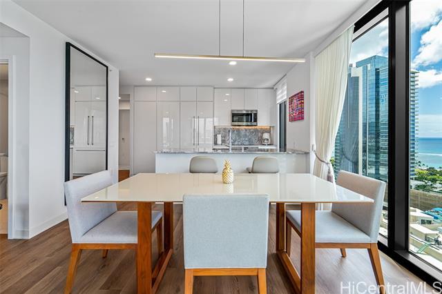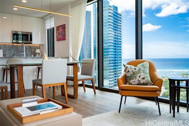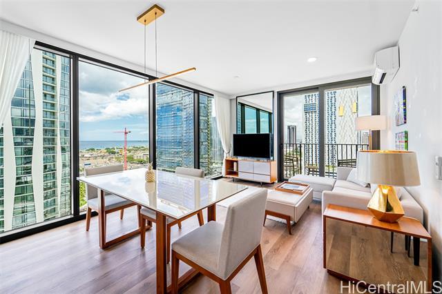Experience luxury living at A’ali’i, where ocean views greet you the moment you enter. The rectangular shape “01” stack offers the only corner 2-bedroom, 2-bath units with floor to ceiling windows, allowing you to enjoy stunning views from the living room, kitchen and bedrooms. This fully furnished TURNKEY home designed by Rottet Studio includes its own 37 sq ft STORAGE ROOM on the 22nd floor, an EV charger equipped parking with extra overhead storage, an upgraded TOTO washlet, two walk in customized closets, Bosch appliances, and blackout shades in both bedrooms. A wide range of amenities including an outdoor sky deck, spacious gym, yoga room, BBQ areas, large pool and jacuzzi, event rooms, are all extensions of your living space. A’ali’i represents luxurious, sustainable, and well-designed living in one of the most sought-after locations at Ward Village in Honolulu.