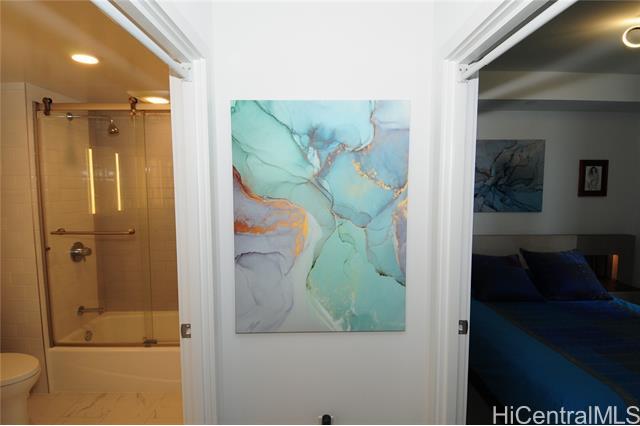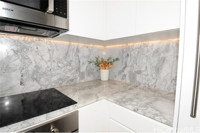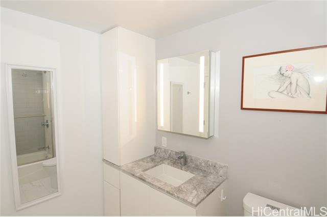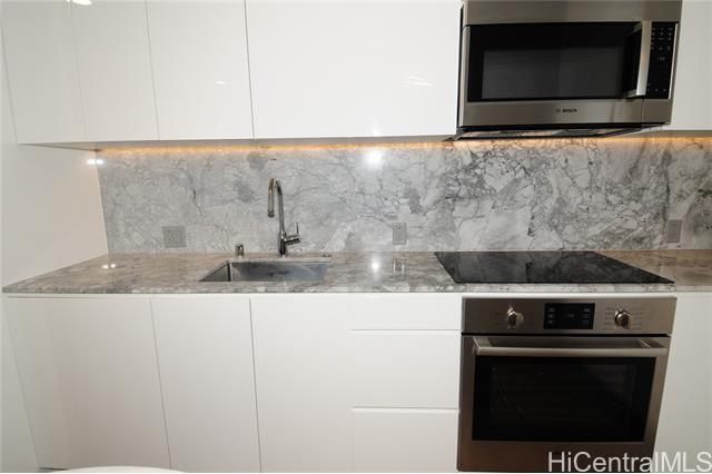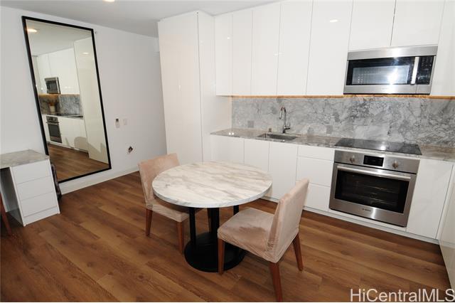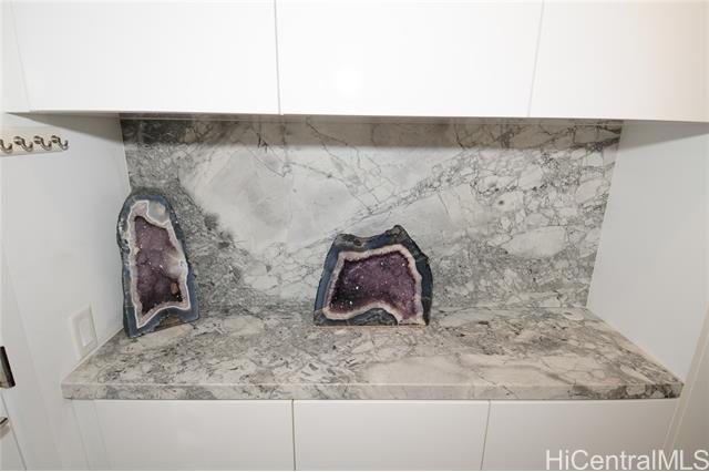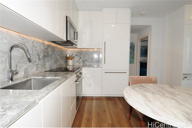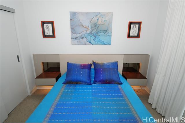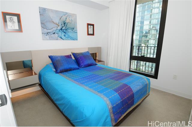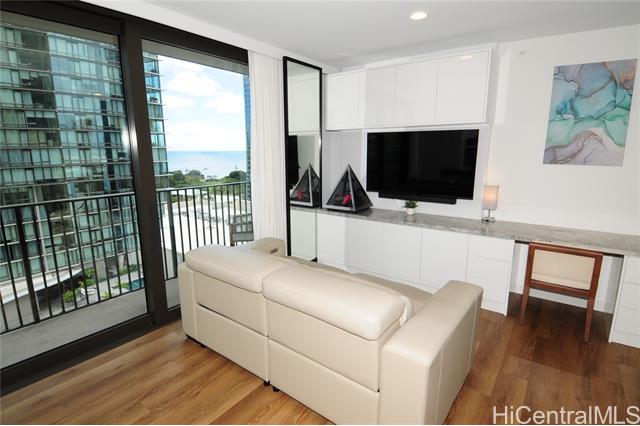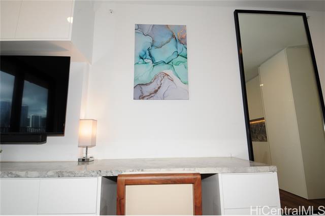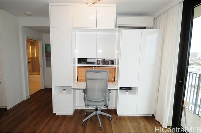 VA assumable loan (@5%) on this spare no expense custom unit featuring additional work station, entertainment storage system, bed system, and added entry cabinets/art presentation area round out this perfect unit. The owners obtained the last few pieces of matching countertop and matched the new cabinets to the white glove developer's package to create this ultimate unit. There are no other 1 bedrooms close to this one! 2 storage units, ultra rare find in Kakaako. These are in addition to the over the vehicle storage at the covered parking space. Aalii has every amenity you could want in a luxury building. Rooftop public areas, large gym with all equipment, movie theatre, cabanas and pool side suites for use by reservation, and even surfboard storage and pet areas on the property. And if you ever choose to leave the building you're in the heart of Kakaako next to Whole Foods, new restaurants, movie theatre, and large park areas. For the outdoor beach lovers you're around the corner from the largest beach park in the state with all the surfing, sunning, and outdoor activities you would ever want. Don't miss this one, it is the best one bedroom unit in Kakaako.