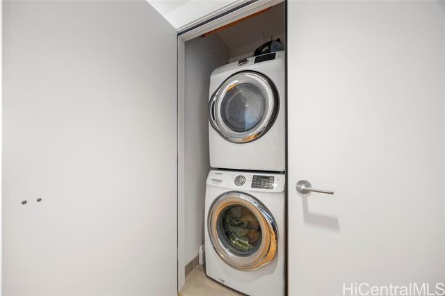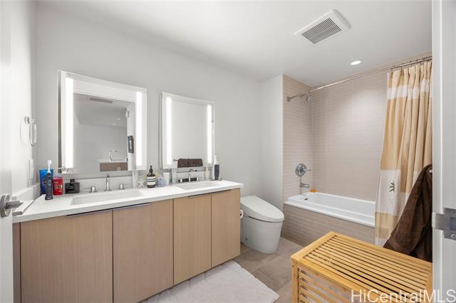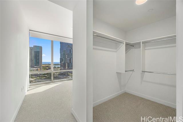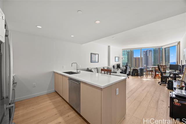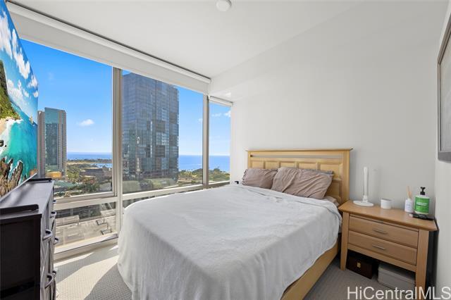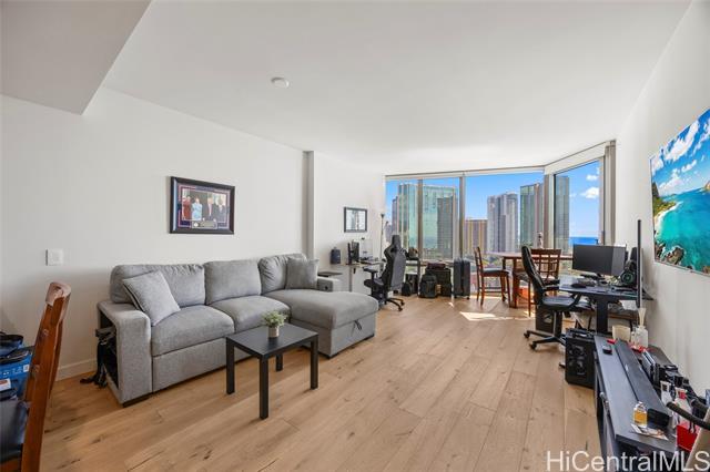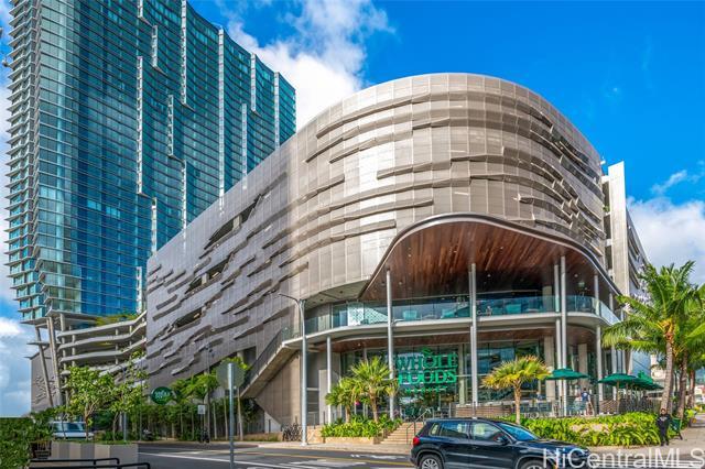Located in the heart of Ward Village, Ae‘o stands as one of Kaka‘ako’s most sought-after luxury residences. This 1-bedroom unit is situated on the highly coveted "East Side" (the Diamond Head side), widely considered the building's preferred orientation for its iconic views and natural light. The 653 sq. ft. floor plan is thoughtfully designed with a sleek, minimalist aesthetic that emphasizes the stunning beauty of the Pacific. At the heart of the home, the gourmet kitchen features premium Bosch stainless steel appliances, elegant quartz countertops, and a polished backsplash. This open-concept layout creates a seamless flow, allowing you to prepare dinner while gazing out at the coastline. Beyond the residence itself, Ae‘o offers a lifestyle of unparalleled convenience, most notably through its direct, private elevator access to the flagship Whole Foods Market located right downstairs.