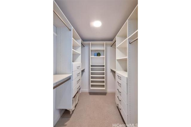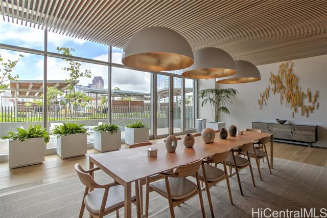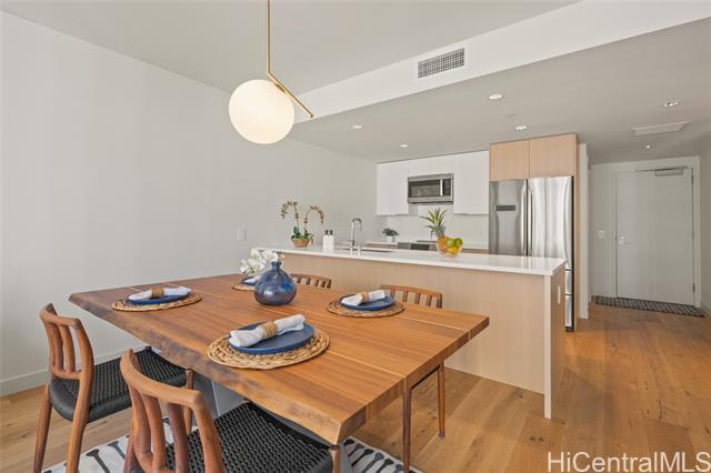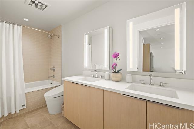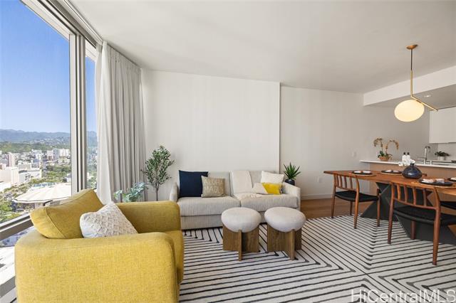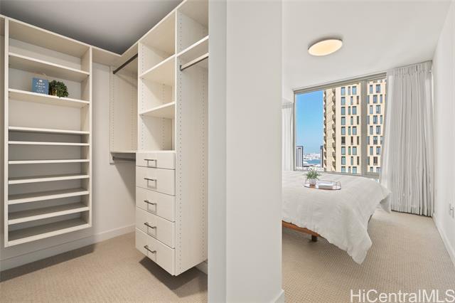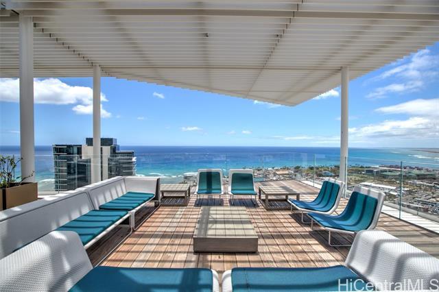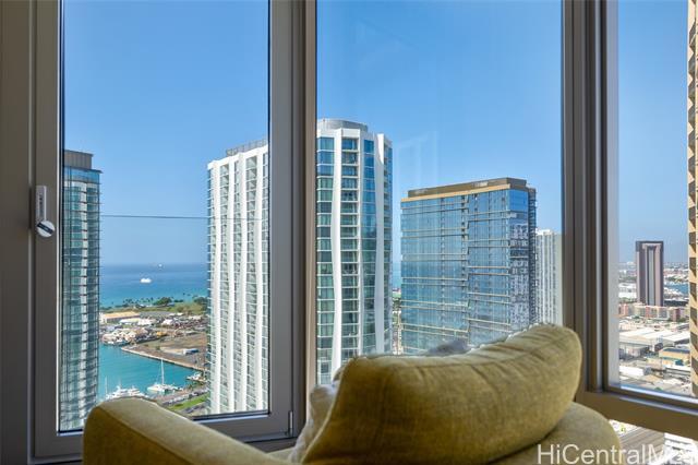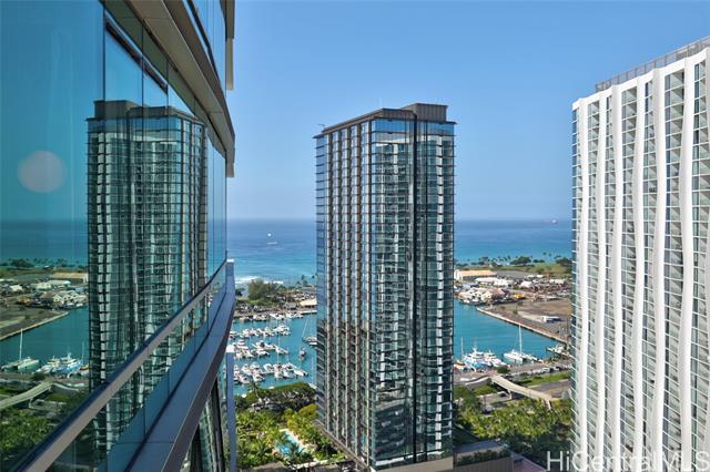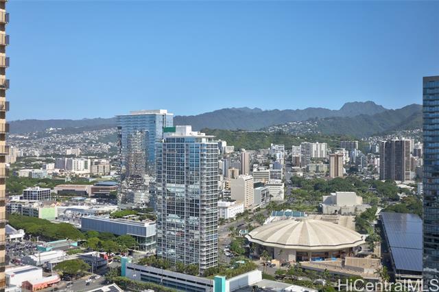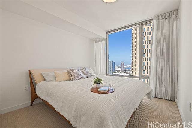 PRISTINE, HIGH-FLOOR, LARGEST 1/1 home at Ae'o with ocean, mountain/city views! This turn-key unit has Bosch stainless steel appliances, engineered hardwood floors, large laundry space, built-in closet system and motorized window treatments. List includes inspiration and Shari Saiki high-end furniture. It has a full-size parking stall on the 3rd floor. Resort-like amenities include a 24/7 hosted front desk, lap and family pools, whirlpool, fitness center, locker rooms with a sauna and steam room, theater, playground, guest suites, outdoor BBQ/dining cabanas, dining and media rooms with a chef's kitchen. Ae'o has direct access to the largest 2-level Whole Foods Market in Hawaii. Experience urban lifestyle in paradise with numerous dining & shopping options, Ala Moana Beach Park, Ward Theaters, Ala Moana Shopping Center, all in close proximity. Condo is currently vacant and easy to show.