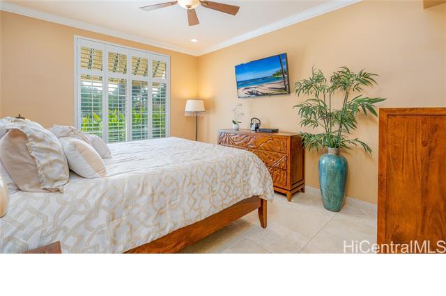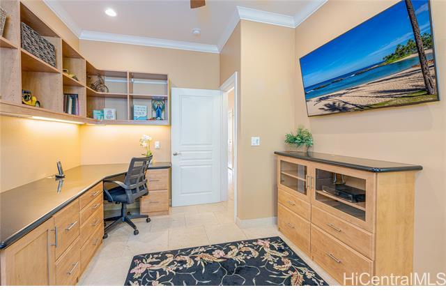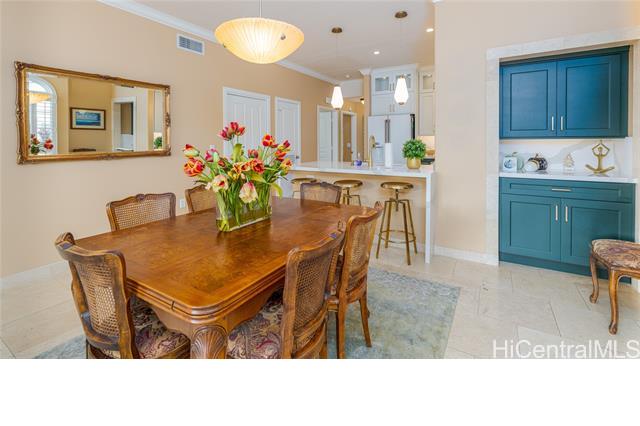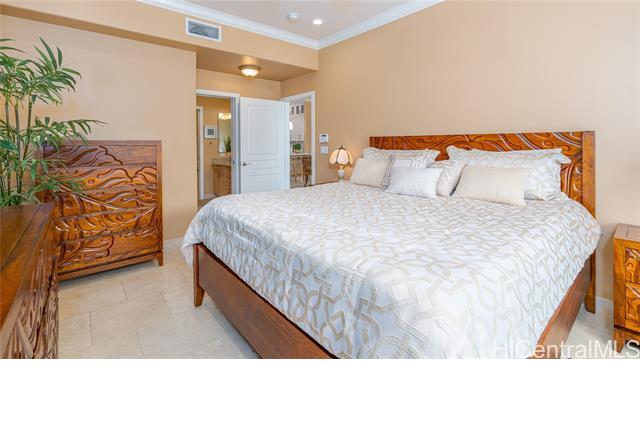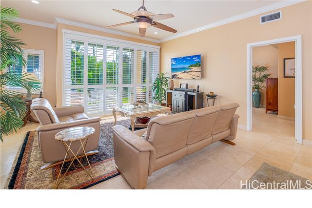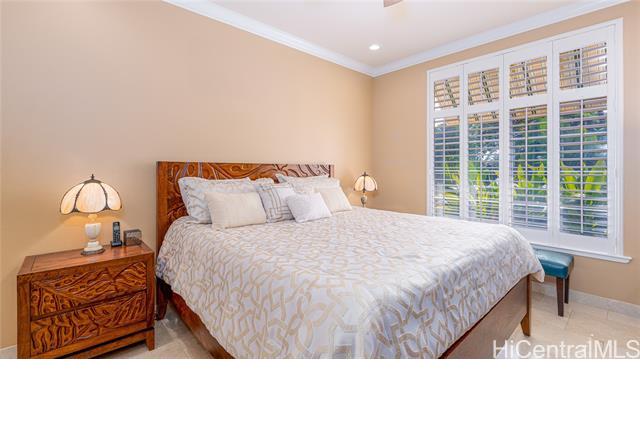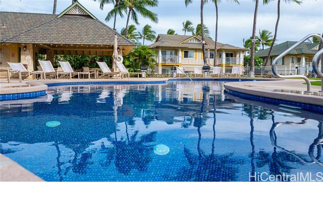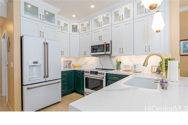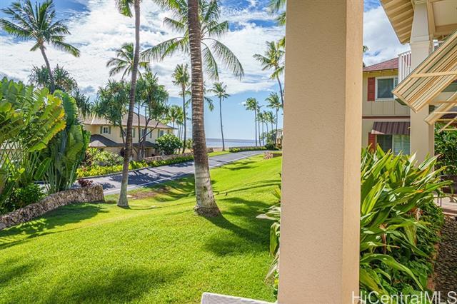 Ocean view 3 Bedroom 2 Bath beautiful ground floor in Kai Lani with marble flooring throughout and a fabulous remodeled kitchen with GE Café appliances. Fully furnished in a chic blend of French antiques and island-style furniture. Pristine condition and never a rental! Gorgeous ocean and sunset views from the lanai, living area, and primary suite. Spacious en suite with walk-in closet, double vanity, soaking tub, and shower. Guest bedroom plus 3rd bedroom with built-in office. Upgrades include A/C (replaced in 2018), plantation shutters, ceiling fans, crown molding, water softener, security system and electric outlet to parking stall. Parking for 2 with garage + stall. Close walk to pool and manager’s office. Kai Lani features a heated pool, whirlpool, grills, and dining area. Live the resort lifestyle with lagoons, restaurants, market, café, golf, tennis, pickleball, spas, and sunsets. Neighbors include Disney’s Aulani, Four Seasons, and Marriott Beach Club. Fees cover fitness classes, gym, tennis, pools, premium cable, internet, water, sewer, landscaping, building maintenance & insurance.