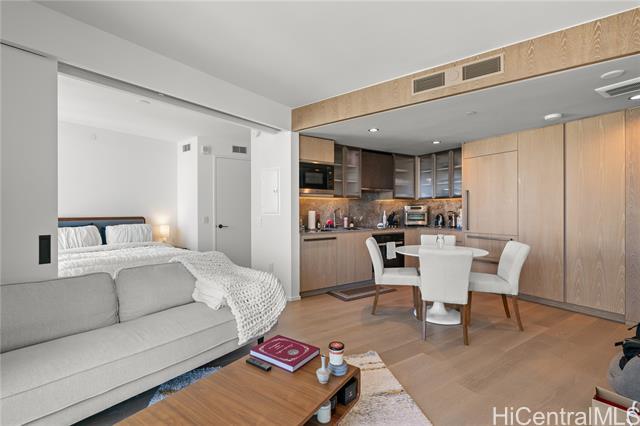 Koula is designed by Jeanne Gang, one of TIME Magazine's 100 Most Influential People in 2019. This one-bedroom unit is efficiently designed to maximize the limited interior space and is fully equipped with amenities, and ready to move in with furniture purchased from Inspiration Furniture. It boasts a full range of resort-style amenities that blend Hawaiian island style with modern design, including a well-equipped fitness center, lap pool, two spas, poolside event room, cabanas, grand lanai and lounge, barbecue pavilion, guest suite, and dog park. Whole Foods Market is in walking distance and there are also many selections of the restaurant, including Japanese Izakaya, Italian, and yakiniku (Japanese BBQ) etc located in within one block away.