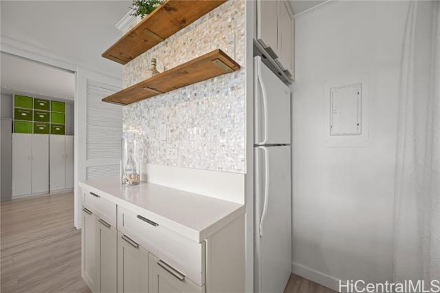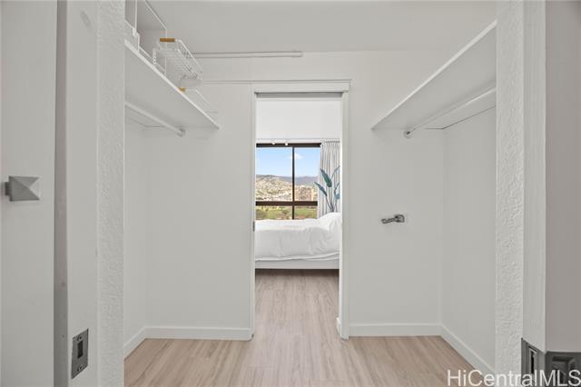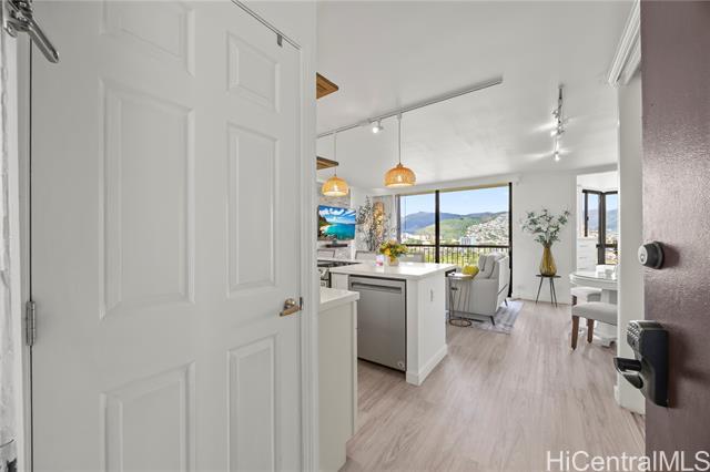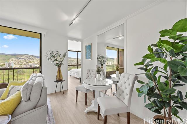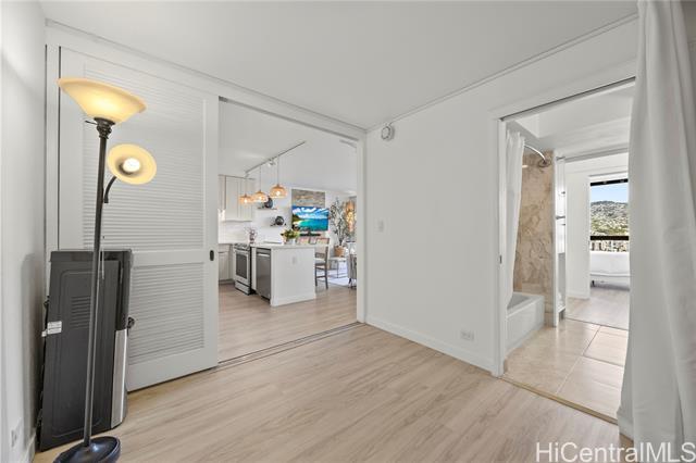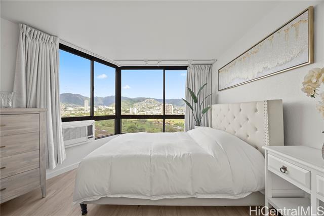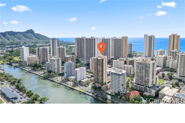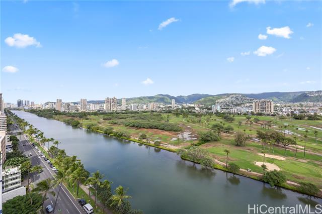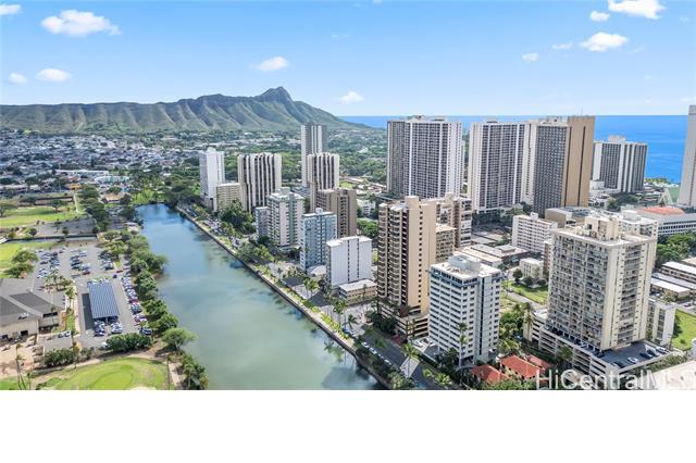 Monte Vista is a 24-story building on the east end of Waikiki along the Ala Wai. This mauka-west corner end unit is the preferred 05 with only one neighbor. Catch the cool tradewinds and enjoy your peaceful water, mountain and golf course views. The entire unit is light and bright with upgrades and thoughtful finishes throughout. The open kitchen allows large countertop dining. There is a washer dryer in the unit, two bedrooms with a full bath in between, window AC and a step out lanai. The second bedroom is a flexible space and would also make a great home office. The secure parking stall is one of the best; just a floor up from the street and large. A perfect residence, vacation home or investment. Walk to the resorts, beach, dining and shopping easily.