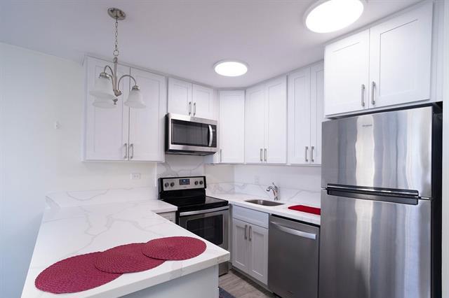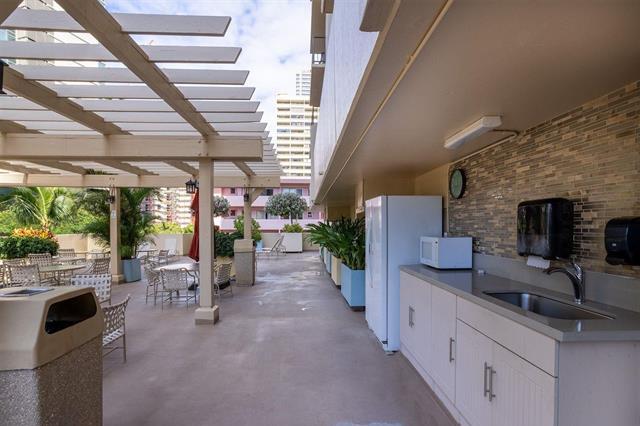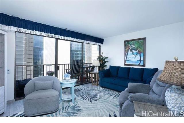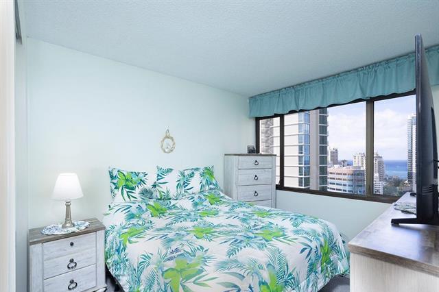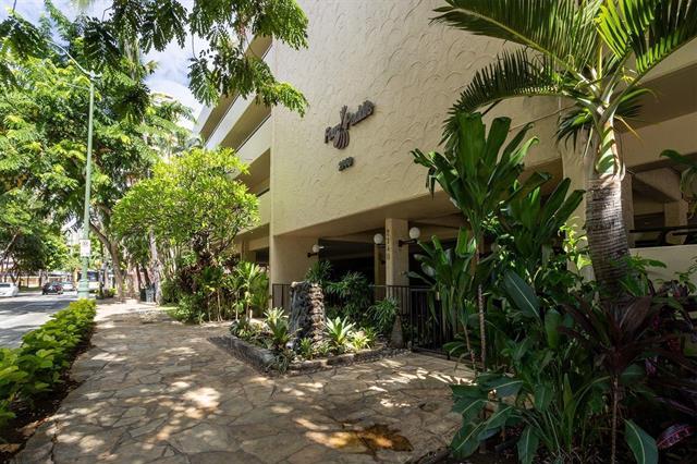 This exquisitely renovated one-bedroom, one-bath end-unit offering a serene, ocean view. This elegant home features generous closet space, custom remote-controlled blinds (Levitor) in both the bedroom and living room and new valances. Thoughtfully designed with modern finishes & exceptional attention to detail, the rare convenience of parking on the lobby level. A truly sophisticated residence also includesated retreat combining comfort, privacy, and the charm of Waikiki. Renovations were done in 2022 and included remodeling the kitchen, replacing the kitchen counters, vanity cabinet & lavatory cabinet. The linen closet was transforned to a smaller closet. There is a stainless steel full size stackable washer and dryer, new kitchen ligome renovations were done by the prior owner) Just minutes from the beach, shopping, restaurants, schools and churches. Kapi'olani Park, Ala Wai Golf Course. Bus stop is about half a block away. On the 5th floor is the pool, sauna, jacuzzi, pool deck and BBQ gas grills w/a valet kitchen. There is a doggie path on the side of the building. There is 24-hour security, a manager & great maintenance staff. Come take a look at your future home!