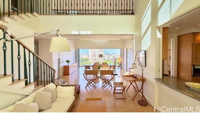 Penthouse living at Courtyards at Punahou—an exceptionally rare, two-story residence with direct elevator entry into the unit for true privacy and a grand arrival. This distinctive layout offers 3 bedrooms, including a bedroom on the main level—ideal for guests, a home office, or long-term ease of living without relying on stairs. Step outside to a spacious rooftop retreat and take in sweeping views of the lush, green Punchbowl slopes, creating a peaceful, elevated sanctuary in the heart of town. Whether entertaining under the sky or enjoying quiet mornings, the rooftop offers a remarkable indoor-outdoor lifestyle. Conveniently located near Punahou School, UH, Kaka‘ako, Downtown Honolulu, and freeway access, this penthouse delivers the best of urban convenience with a sense of seclusion above it all. A truly special residence to enjoy for years to come.