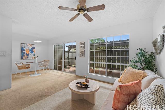 Rarely available single level townhome with no neighbors above, offering, enhanced privacy and comfort. This residence includes 3 parking stalls - two covered and one open. The unit is ready for your personal touches, providing an excellent opportunity to customize the space to your preferences. There is also a covered lanai great for eating outdoors & ample guest parking throughout the community. Conveniently located to Costo, a variety of shopping and dining options, and offers easy access to freeway on ramps. Residents also enjoy nearby walking paths.