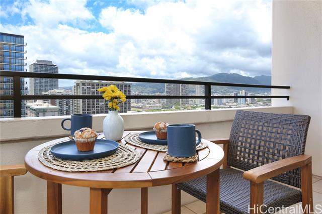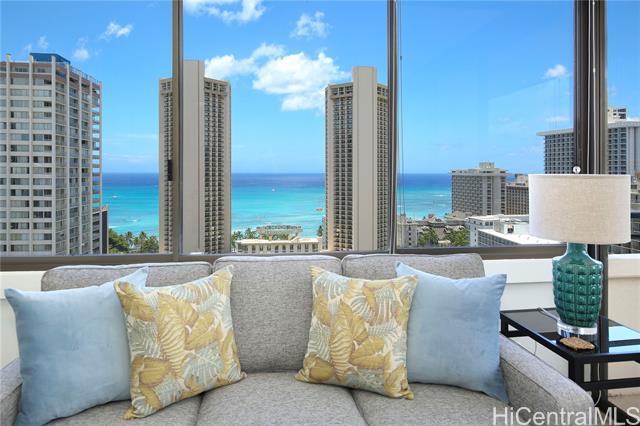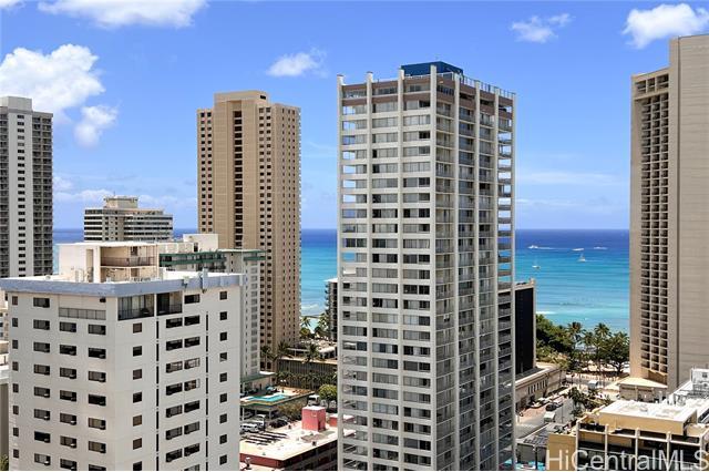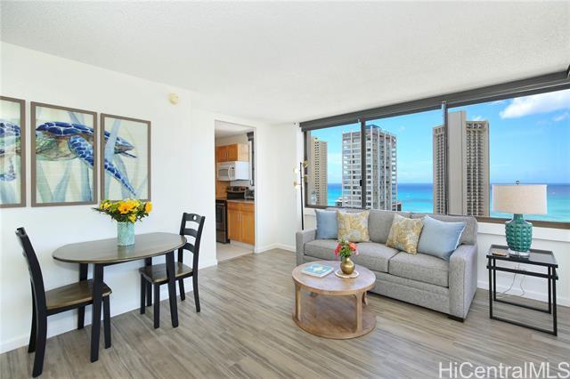 Location, Location, Location! Waikiki Skytower #2604 offers stunning 180-degree ocean, city, sunset, and Friday night fireworks views, plus TWO tandem covered secured parking stalls – a rare find in Waikiki. This fully furnished 1BD/1BA unit is move-in ready and currently operated as a 30-day minimum rental, making it ideal as an investment property or vacation home. Features include a spacious living area, remodeled kitchen and bathroom, and upgraded luxury vinyl plank flooring throughout. Relax on the large lanai and enjoy the island breeze. Just 4 blocks to Waikiki Beach and within walking distance to International Market Place, Kapiolani Park, tennis courts, surf spots, shopping, and dining. Building amenities include pool, BBQ area, sauna, recreation area, surf and bike lockers, guest parking, and pet-friendly policies (verify). Enjoy the best of Waikiki living with flexibility, convenience, and income potential. Seller will pay full amount of 2026 assessment ($472.50/month) before closing.