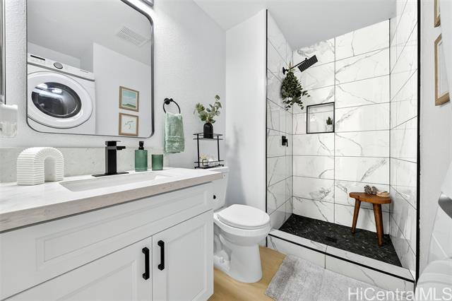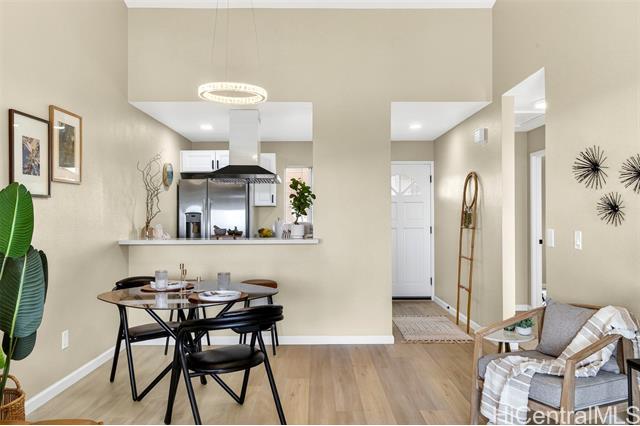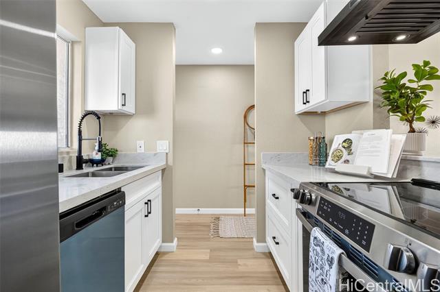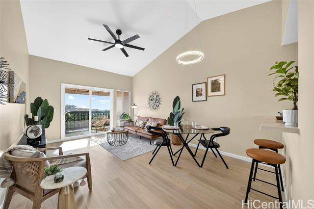 Move-in ready and fully renovated 2-bedroom, 2-bath home in Westview at Makakilo Phase 2 with ocean and mountain views! This beautifully updated unit features luxury vinyl flooring throughout, fresh paint, and all new light fixtures for a bright, modern feel. The kitchen has been upgraded with soft-close shaker cabinets, quartz countertops, and brand-new appliances including a dishwasher. Both bathrooms are fully renovated with stylish finishes and tiled walk- in showers. Enjoy the covered lanai, perfect for relaxing or taking in the views. Conveniently located next to guest parking and mailboxes, with two assigned parking stalls included. Walking distance to parks and outdoor spaces. A turnkey home ready for its next owner to move in and enjoy!