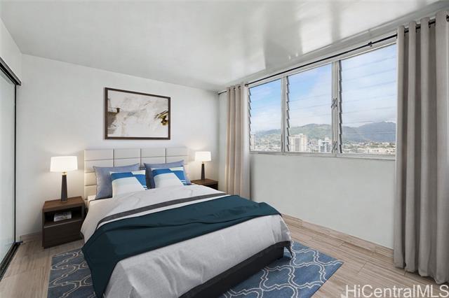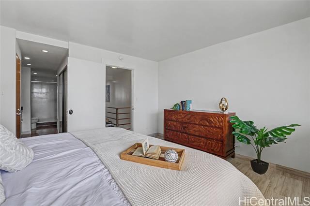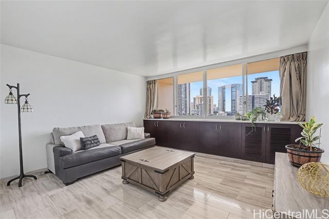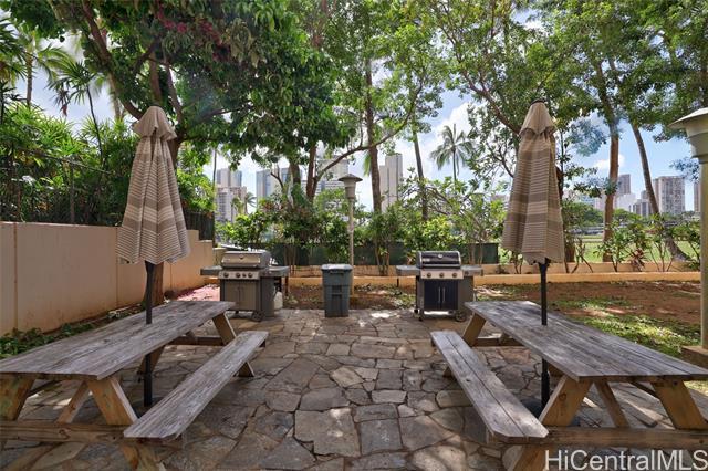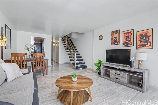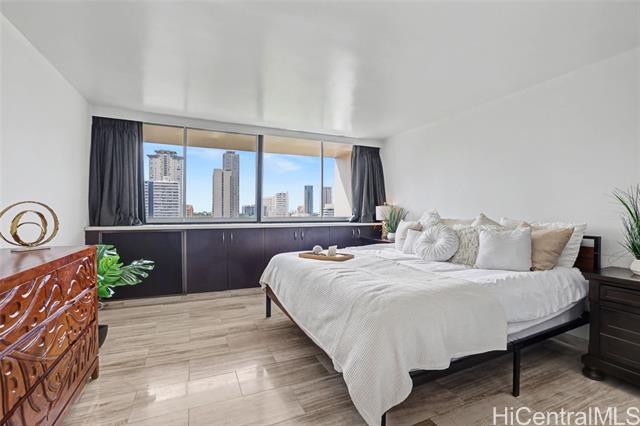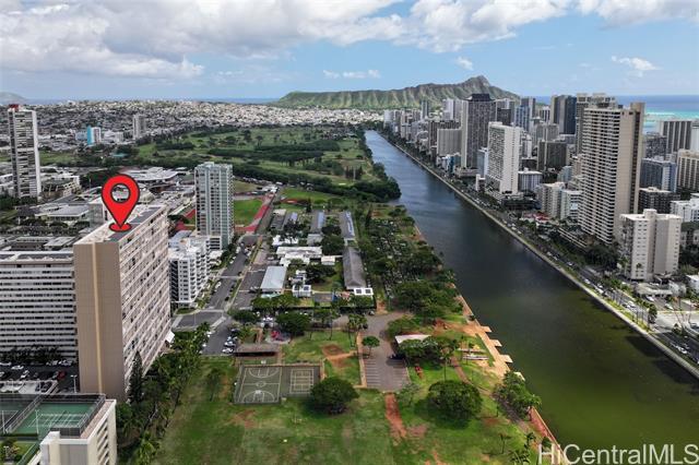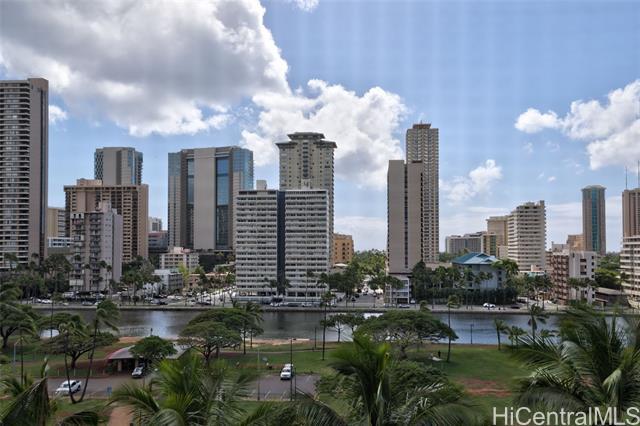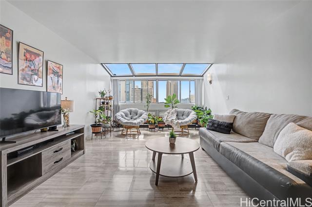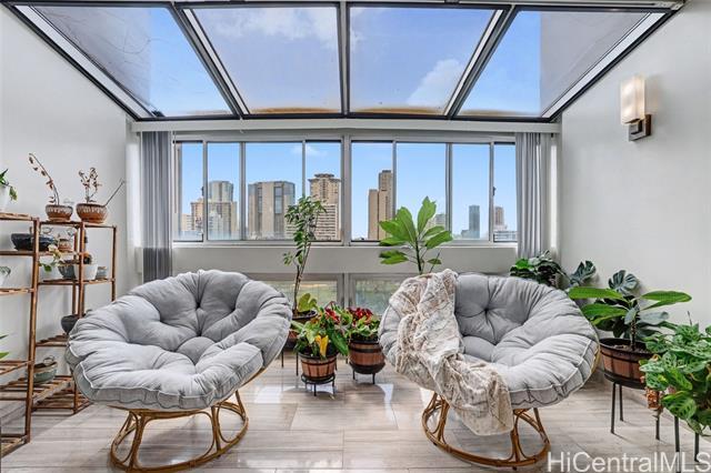Welcome to Ala Wai Plaza, where expansive park and canal views meet the iconic Waikiki skyline and swaying palms below. This beautifully updated two-story residence offers over 1,500 SF of interior living space, highlighted by a dramatic wall of glass framing sweeping views and filling the home with natural light. Overhead skylight panels with retractable shades and smooth ceilings enhance the modern aesthetic. The split-level design delivers the comfort and flow of a home with the convenience and security of vertical living. Mountain-to-ocean breezes flow naturally, with window AC for added comfort. The contemporary kitchen features a Thermador refrigerator and cooktop with sleek Zephyr range hood. Three spacious bedrooms upstairs include two with expansive views, while the third captures lush mountain ridgelines and passing rainbows. Includes full-size washer and dryer and covered parking. Pet-friendly with 24-hour security, pool, fitness center, BBQ area, bike/surfboard storage, and car wash area. Near UH Manoa, beaches, Ala Moana Shopping Center and Waikiki.