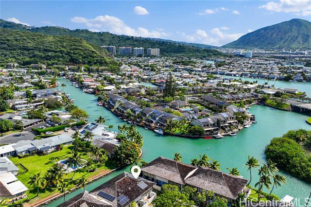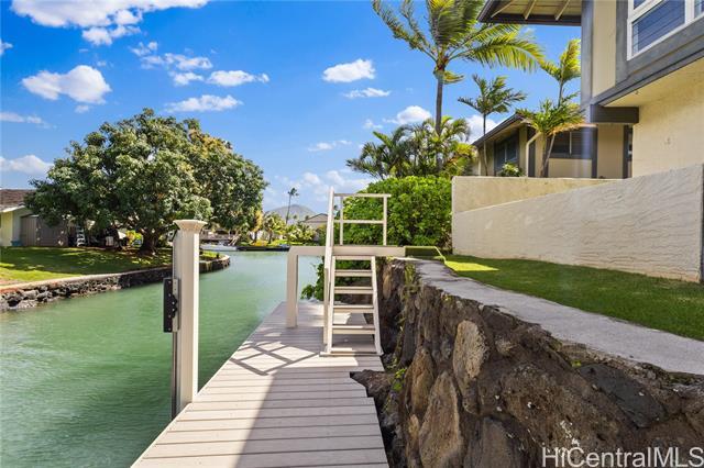 Corner-end waterfront townhome in the sought-after Gateway Peninsula marina community. This pet-friendly, two-level residence offers approximately 1,850 sq ft with central A/C, a mix of hardwood and tile floors, upgraded windows and doors, plantation shutters, and privacy blinds in the bedrooms. Multiple lanais on the front, side, and rear—finished with stamped concrete and premium turf—enhance outdoor living. Storage is abundant with built-in cabinetry, exterior storage, a wood-finished attic, and two covered parking stalls. Sustainability meets savings with 26 owned, net-metered PV panels resulting in minimal electric expense. Popcorn ceiling removed in February of 2026 for a clean, modern aesthetic. Enjoy immediate access to the marina from your private commercial-grade boat dock, ideal for boating, paddling or kayaking. Community features include a pool, clubhouse, guest parking, and on-site resident manager. Conveniently situated near Kalaniana'ole Hwy, directly across from Maunalua Bay, and close to Costco, Safeway, Koko Marina, dining, beaches, and trailheads. A rare opportunity for waterfront living in East Honolulu.