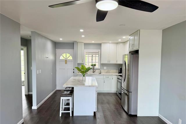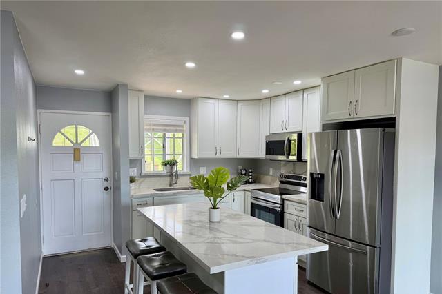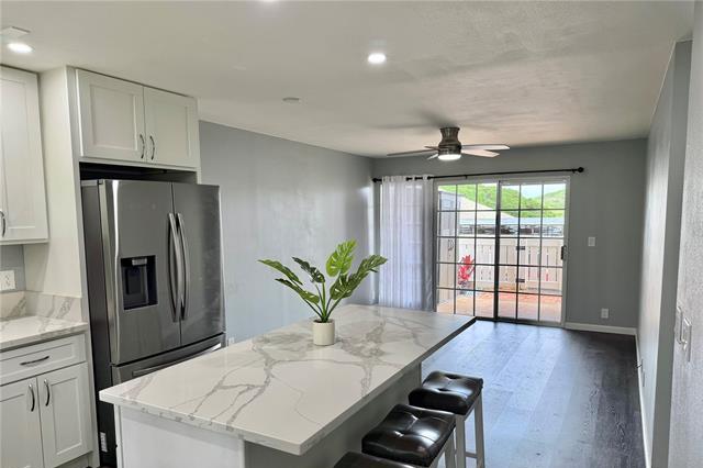 Beautiful remodeled 2 bedroom/2 bathroom single-level condo with its own little gated yard and storage. Unlike most in the complex, this cozy home was modified from the original floorpan to a more contemporary "open-concept design" with a kitchen Island perfect for dining, entertaining, homework and meal prep! To keep electricity costs lower, this home features an 8-panel photovoltaic ("PV") System with net metering! A rare find! Washer/Dryer included (approx. one year old). Window Air Conditioner in primary bedroom. The home includes two assigned, covered parking spaces.