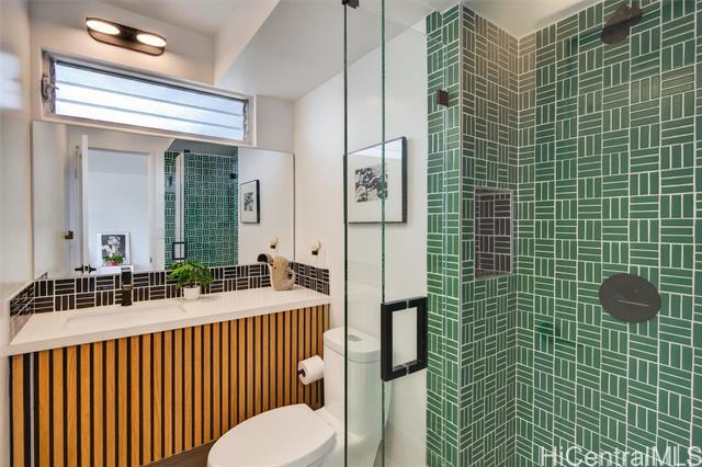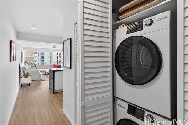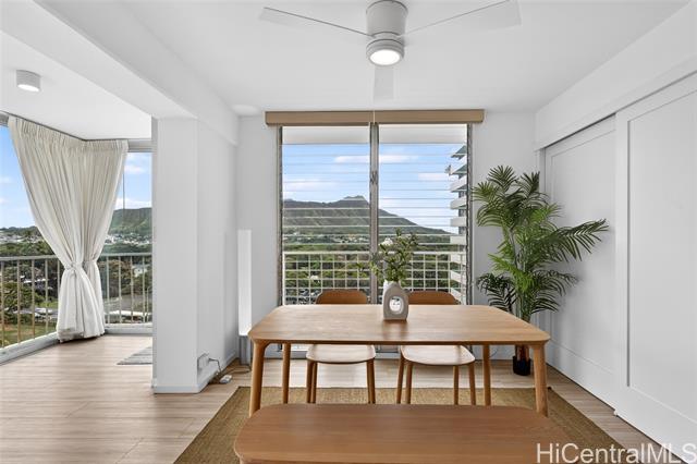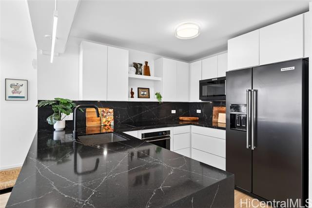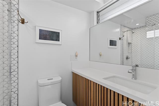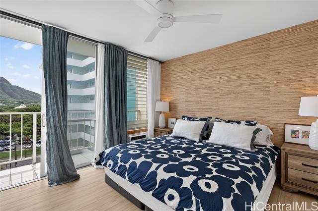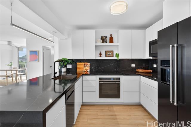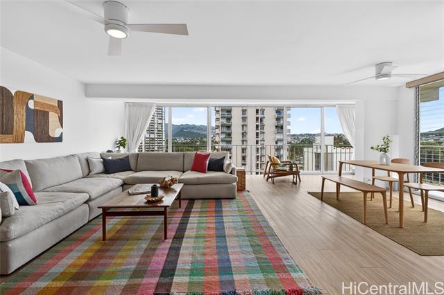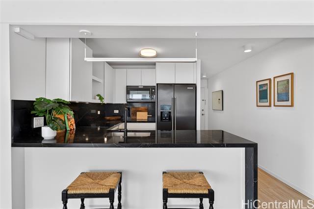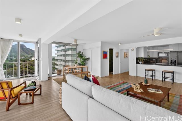 Fully renovated in 2024, this oversized 1-bedroom, 2-bath executive residence showcases breathtaking Diamond Head views and refined modern design throughout. The brand-new kitchen features custom cabinetry, waterfall-edge countertops, new sink with high-end faucet, and all new appliances. New flooring flows seamlessly through the space, complemented by high-end lighting, designer fans, remote-controlled dining window coverings, and full-length curtains for a sophisticated finish. Both bathrooms have been completely renovated with custom tile, floating vanities, new mirrors, and custom glass in the guest bath. The primary suite features a grass cloth accent wall and built-in cabinetry in the walk-in closet. Brand-new washer and dryer included. Furniture available upon negotiation. Vacant and easy to show. Ideally located near Waikiki Beach, Kapiolani Park, the Zoo, and the Shell — enjoy the best of island living with unbeatable city convenience.