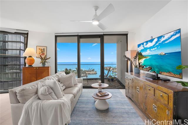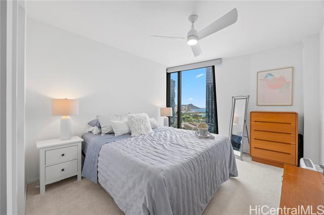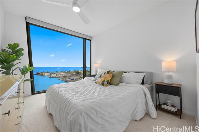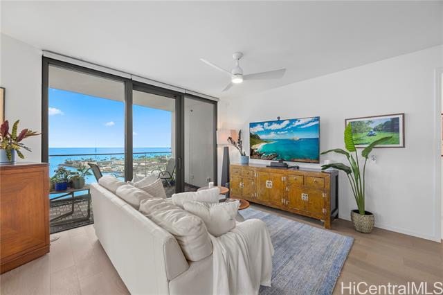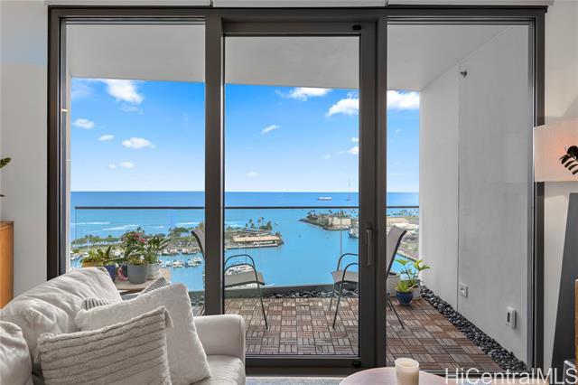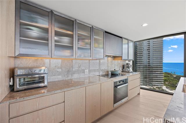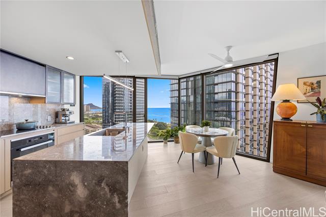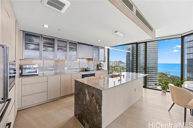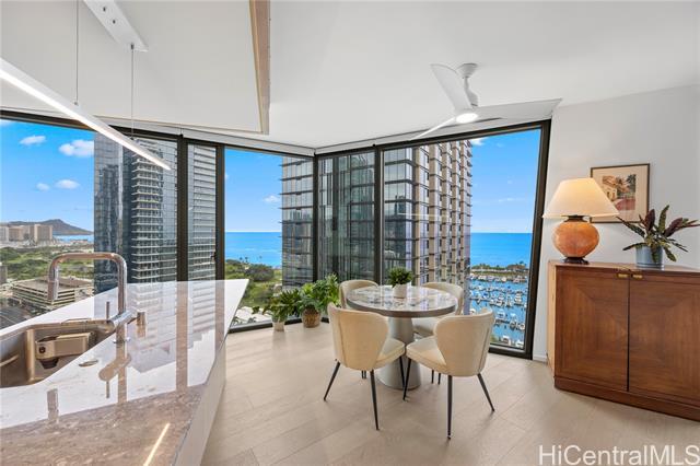 Wake each morning suspended above the Pacific, and unwind each evening with Diamond Head as your backdrop—this is island living at its most elevated. This exceptionally rare 3-bedroom, 3-bath residence at Koula represents one of the most sought-after floorplans in the building, reserved for a limited collection within the coveted 3-bedroom stack—an offering that seldom becomes available. Two private lanais frame breathtaking, direct views of the Pacific Ocean and Diamond Head, blurring the line between indoors and out. Inside, the open floor plan flows effortlessly, dressed in rich wood flooring and flooded with natural light through expansive floor to ceiling windows. The chef’s kitchen outfitted with Miele appliances is as beautiful as it is functional, designed for everything from quiet mornings to effortless entertaining. Steps from Victoria Ward Park directly in the heart of Ward Village, you’re immersed in Honolulu’s finest dining, shopping, and culture. Koula itself is a work of art with world class luxury amenities, designed by internationally acclaimed architect Jeanne Gang as a bold reimagining of modern island living. This is more than a home. It’s a vantage point.