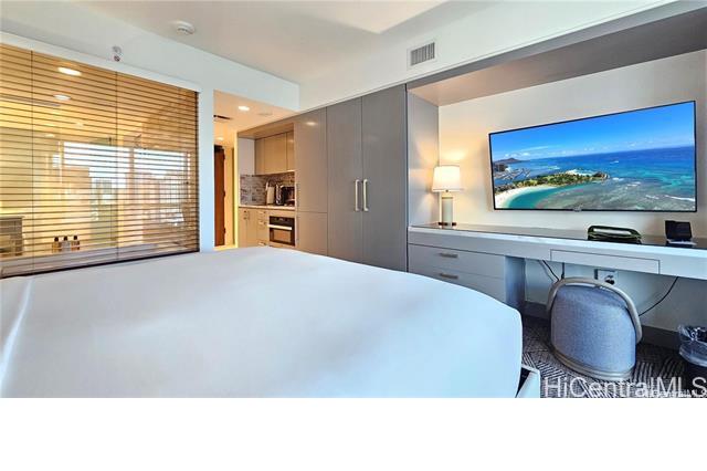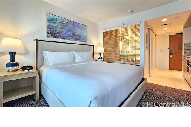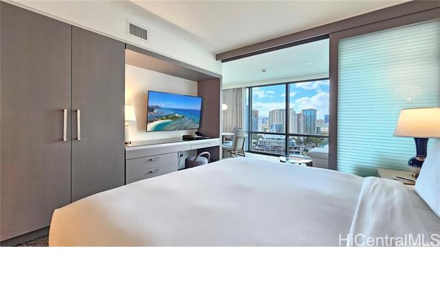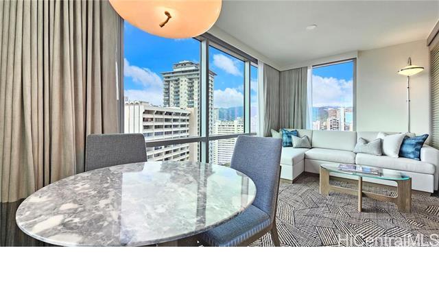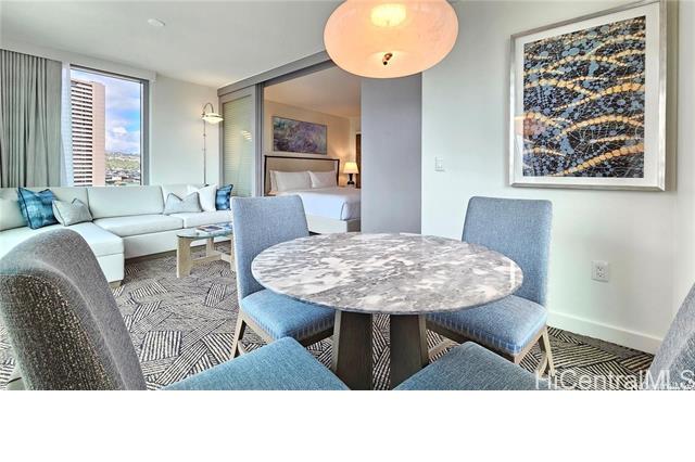 Renovated in Spring 2025, this fully furnished studio is located in one of Waikiki's premier hotel condominiums. The ideal floor plan features a full kitchen, washer/dryer, and a sliding doors separating living/dining area, plus a cozy 4-seat dining set - perfect for both short term and long term stays. This corner unit boasts extra windows that fill the space with natural sunlight. Enjoy resort style living with amenities including two sparkling pools, a modern fitness center, concierge and valet services as well as a popular deli/café and restaurants just steps away.