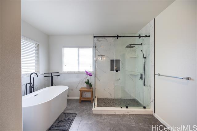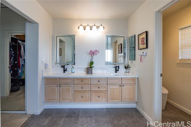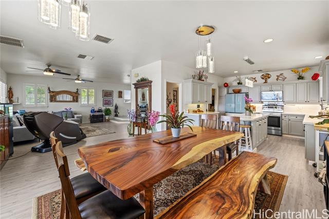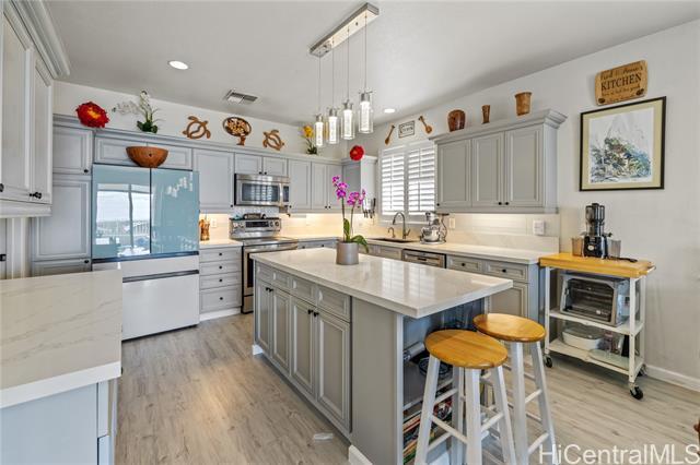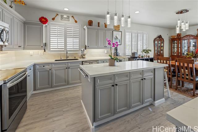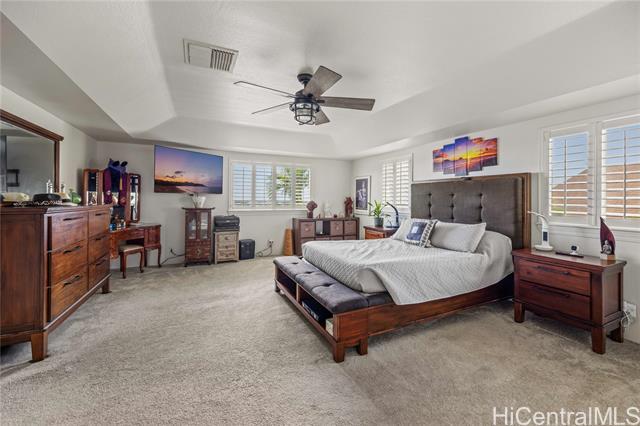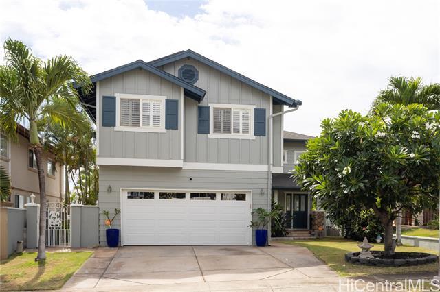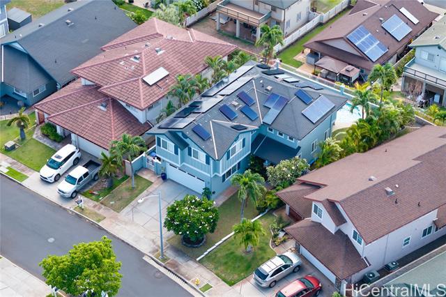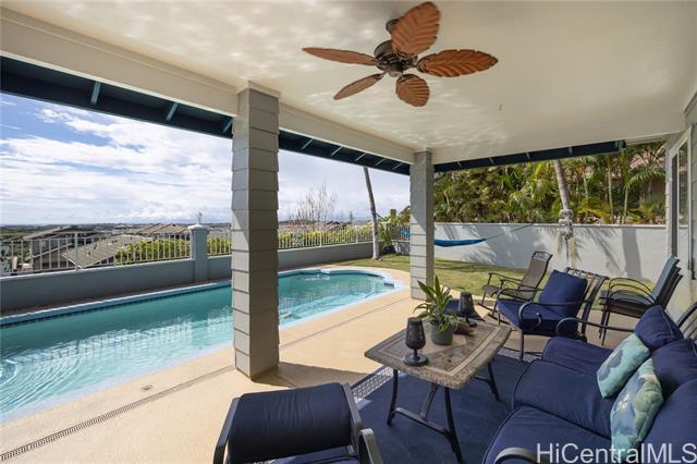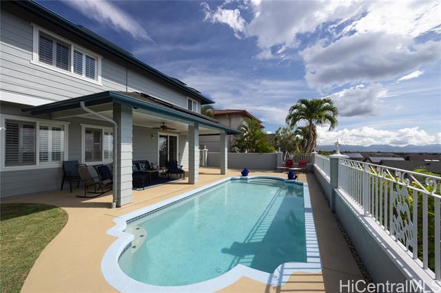 Welcome to this move-in ready home in the highly desirable Kapolei Knolls community! Recently refreshed inside and out with new paint, this beautifully updated residence blends comfort, style and modern convenience. Enjoy effortless living with an fully integrated smart home system featuring a state-of-the art security setup, intelligent climate control and premium WI-FI-enabled appliances. The home includes 34 owned solar panels that includes a battery backup in addition to the 11 existing leased solar panels-offering impressive energy efficiency. Plantation shutters and new flooring, Toto toilets in all bathrooms with a built-in-bidet adds a touch of elegance throughout. Designed for entertaining and relaxation, the property features an extended backyard lanai that opens to a sparkling in-ground swimming pool- a rare find in the neighborhood. Take in panoramic views of Diamond Head and the city coastline as you unwind or host gatherings. Conveniently located to schools, shopping and recreation. Take the plunge, relax and start living your island dream!