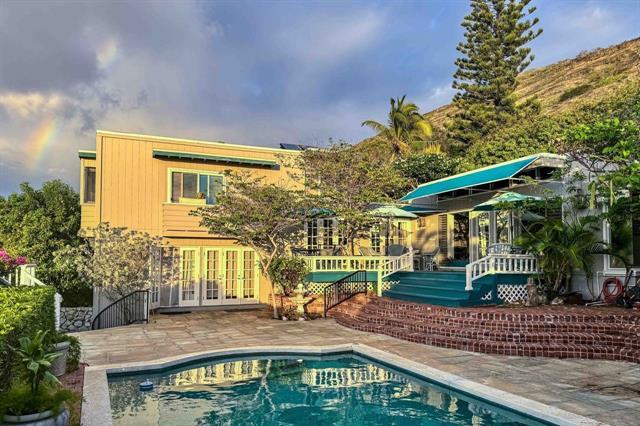 Unique Residence with rare elevation & endless possibilities, this split-level home captures sweeping, cinematic views of Diamond Head, Kahala Coastline, Maunalua Bay & seasonal sunsets. Nearly every room frames the ocean & coastline creating a living experience defined by light breeze and endlessly shifting scenery. Set on terraced lot, the property has a drive-through garage with view deck above, ideal for morning coffee or sunset gatherings. A generous pool terrace offers resort-style setting for lounging and entertaining. A large bedroom and adjacent study/den (optional 3rd bedroom) enjoy direct access to outdoor space. Main living level includes a fireplace, formal dining, informal breakfast area and kitchen with sizable pantry. Upper level is devoted to a spacious primary suite, expanded and designed to capture breathtaking views. Walk-in closet, double sinks, separate shower & private room with soaking tub complete the retreat. Additional features include laundry rm, plentiful storage, cleared terraced backyard for future enhancements. Rare offering in an exceptional location--this home is best appreciated in person, where extraordinary views & charm come fully to life.