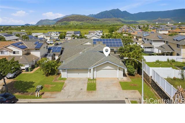 Rarely available in the Maili Kai II community, we offer a 3-bedroom home with 3 full baths! This attached home has 2 bedrooms and 2 full baths on the 1st floor. Upstairs via a spiral staircase is the large primary bedroom featuring a stylish full bath and lanai offering amazing views of the Waianae mountain range. Home features 21 OWNED solar panels on the HECO NEM program. Community minded neighborhood with low maintenance fee of $70. The backyard and tiki bar awaits your personal touch. Close to the famous Pill Box hike, Maili Beach and the community park. MOTIVATED!