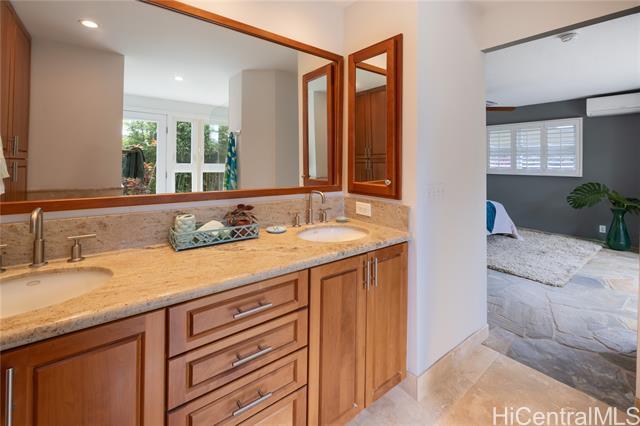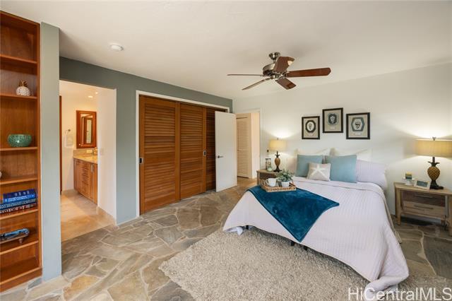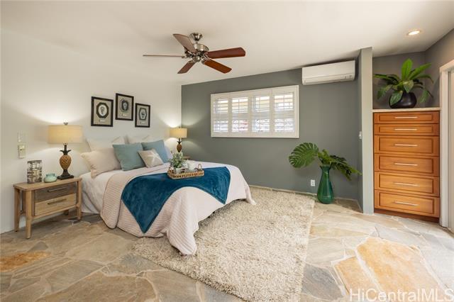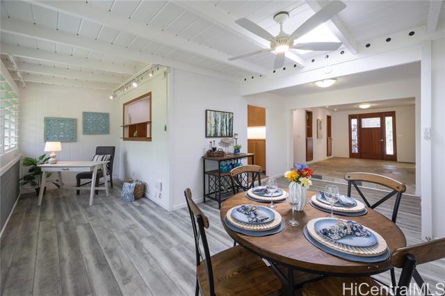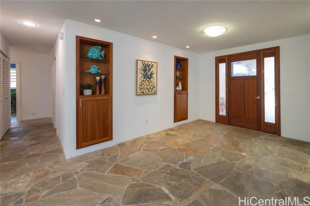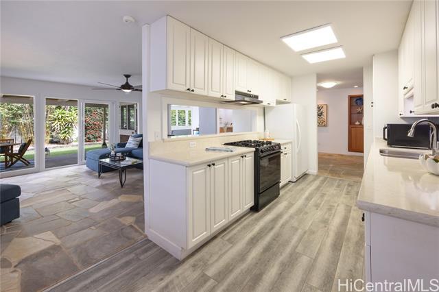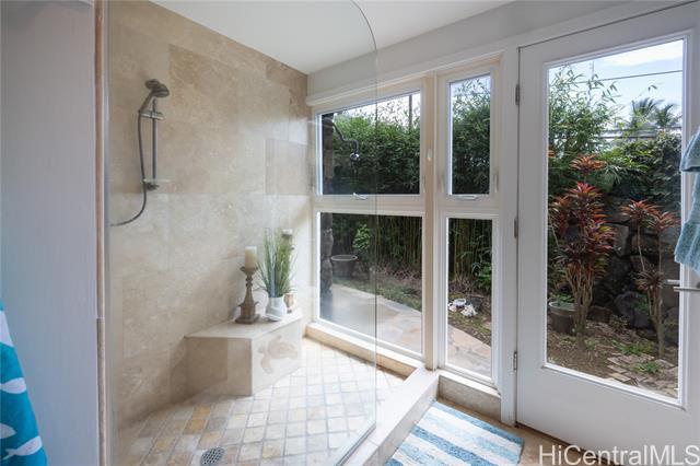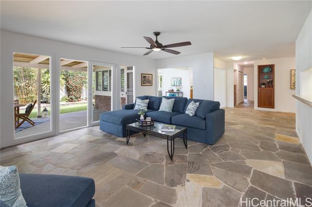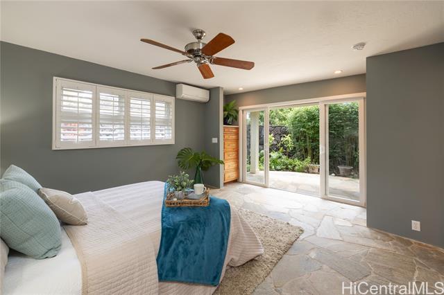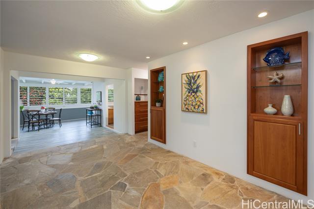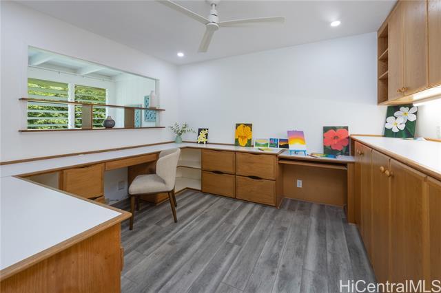 Nestled in the charming community of Kailua, this stunning property is island living at its best! This 4-bedroom, 2-bathroom home is thoughtfully designed with open concept living spaces. The spacious primary suite is the perfect retreat, boasting custom built-in drawers & bookcases and split A/C. The expanded spa-like bathroom also features beautifully designed cabinetry, granite countertops, and a walk-in shower. Enjoy your own private outdoor oasis—complete with a hot water shower, perfect for rinsing off after a day at the beach. Need room to work or create? This house has it all! The 4th bedroom is currently an office/art studio with custom built-ins but can easily be converted back to a 4th bedroom. There is also a 2nd office nook, ideal for remote work or hobbies. 19 prepaid leased PV panels with net metering keep electricity costs low. The interior’s finishes include elegant flagstone flooring throughout the main living areas and luxury vinyl plank flooring for durability and style. Located in top rated Kaelepulu school district, near Kailua's trendy shops, restaurants, and the turquoise waters of Kailua Beach. Don’t miss your chance to call this slice of paradise home!