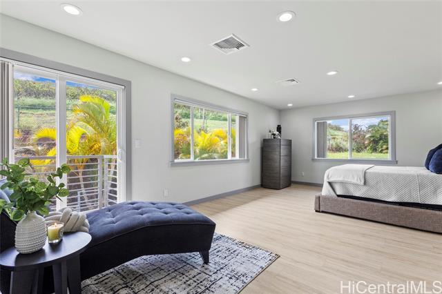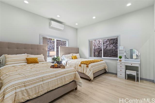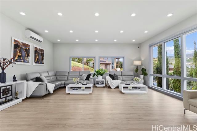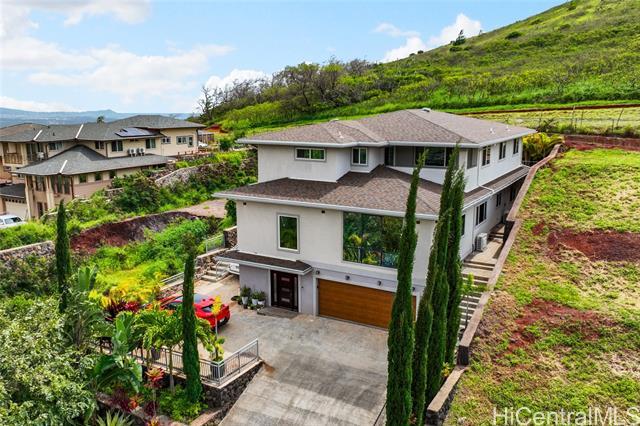 Perched on a perimeter lot in Wai Kaloi at Makakilo, this custom-built 2021 estate blends refined luxury with thoughtful design. Featuring 6 bedrooms and 5 full baths—including two junior suites with en suite bathrooms—this home is ideal for multigenerational living. Soaring ceilings and expansive windows bathe the interiors in natural light, while AC throughout, a central vacuum system, and luxury vinyl plank flooring throughout provide effortless comfort. The gourmet kitchen is beautifully appointed with quartz countertops and a statement copper sink, plus a separate wet bar with its own copper sink for elevated entertaining. The primary suite is complete with its own balcony capturing sweeping East Honolulu views, an expansive walk-in closet, and a spa-inspired bath with rainfall shower, jet tub, dual vanities, and a dedicated cosmetic vanity. A motorized entry gate enhances privacy, while an elevator, 4-car garage with EV chargers, lush tropical landscaping, and generous outdoor space for gatherings or additional parking complete this island sanctuary. Seller has approved permits to expand the interior living sq ft and construct a new garage, offering future growth.