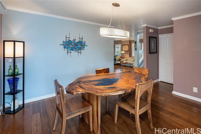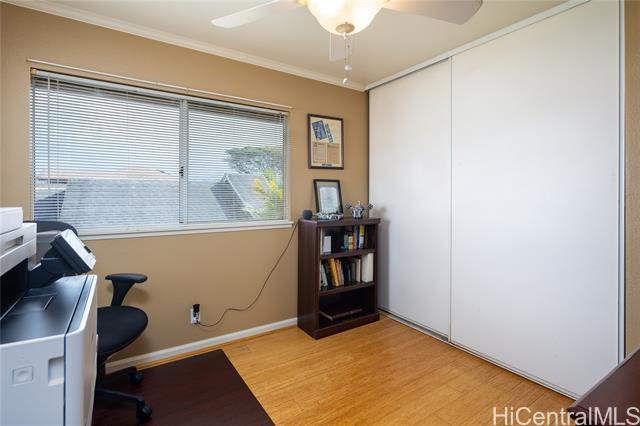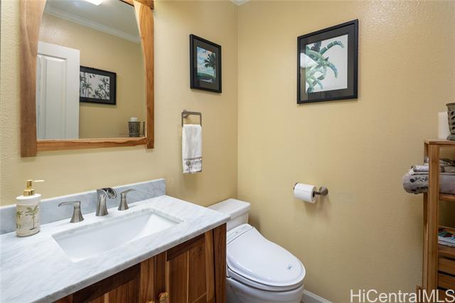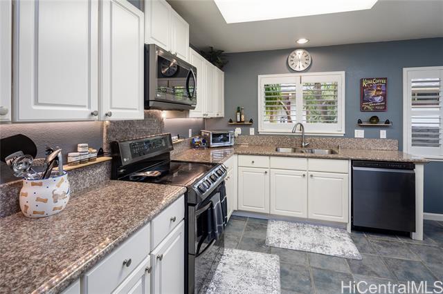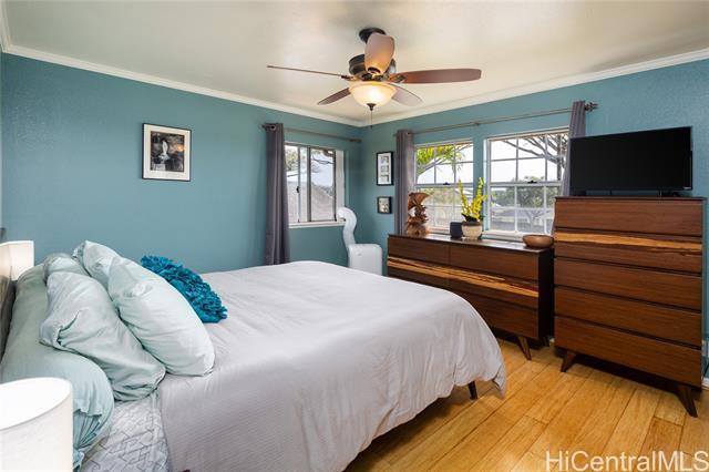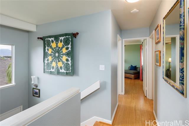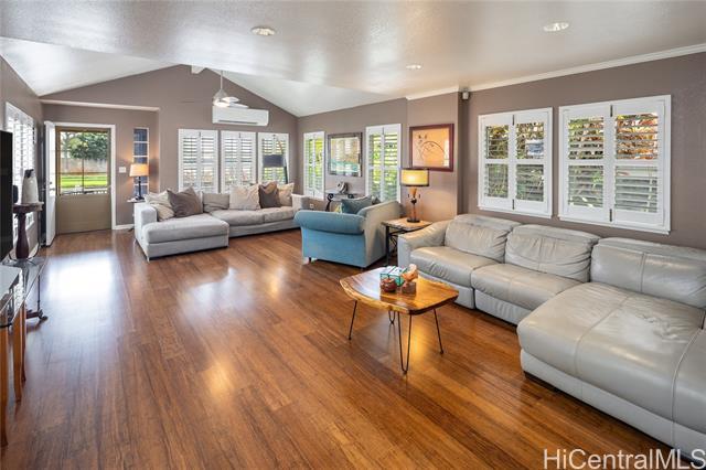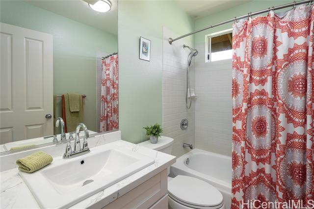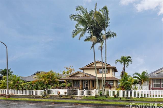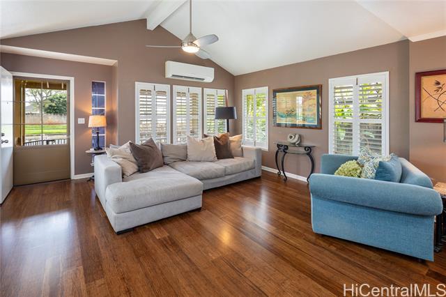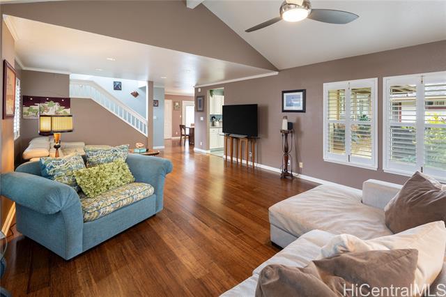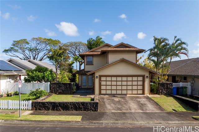 Welcome to your 2-story single-family home situated on a quiet cul-de-sac in the highly desirable Millilani Mauka neighborhood. This 3-bedroom, 2.5-bath home features beautiful bamboo flooring throughout and 31 owned solar (PV) panels paired with a battery backup system. Downstairs includes a spacious dining room with French doors leading to the courtyard, an expansive living area, the kitchen, and a powder room. The eat-in kitchen is equipped with modern appliances, ample cabinetry, and coffee station. Upstairs, the primary suite has an updated en-suite bath and mirrored closets. Updated hall bath and two more rooms offer flexibility as a bedroom or dedicated home office. Enjoy the courtyard, or unwind on the front lanai, taking in Hawaiian breezes. Residents benefit from membership in the Mililani Town Association offering access to recreation centers, swimming pools, parks, playgrounds, and walking paths. Conveniently located near shops, highly rated schools, freeway access, and major military installations including Schofield Barracks and Wheeler Army Airfield. A rare opportunity to own a move-in ready home in one of Central Oahu’s most established master-planned communities.