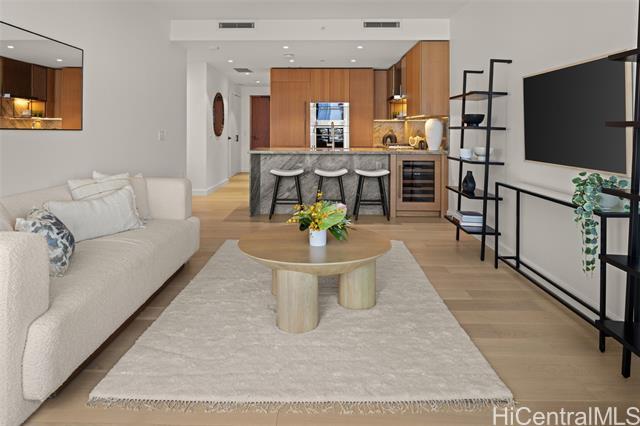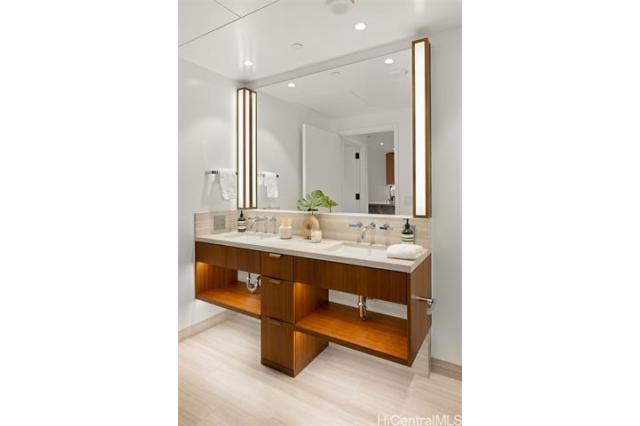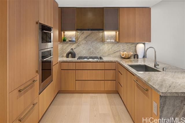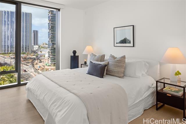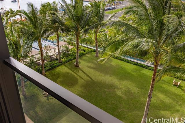 New Turn-Key Listing at Victoria Place, Ward Village. Beautiful, fully-furnished 1-bedroom, 1-bath residence with one reserved parking stall, overlooking the lush amenity deck. Located in Victoria Place, the newest luxury building developed by Howard Hughes Corporation within the Ward Village master-planned community. The residence features custom cabinetry by Studio Becker, a Sub-Zero refrigerator, and Wolf gas range, oven, and microwave. This 350-unit front-row development was designed by Solomon Cordwell Buenz and offers resort-style amenities, including lap and lounge pools with ocean views, a wine cave, spa, hot and cold plunge pools, fitness center, movie theater, and 24/7 concierge and valet services.