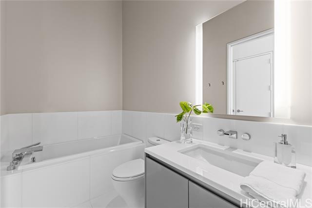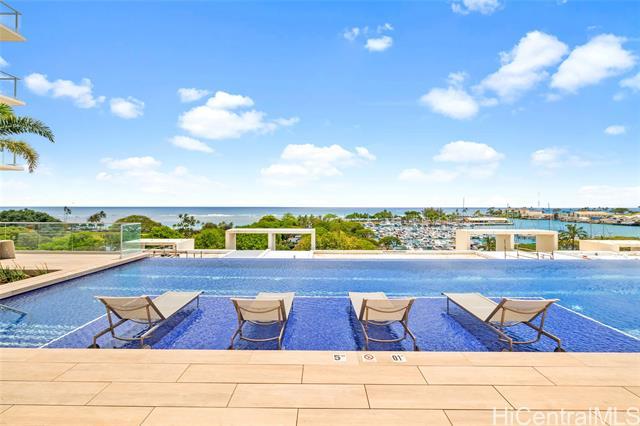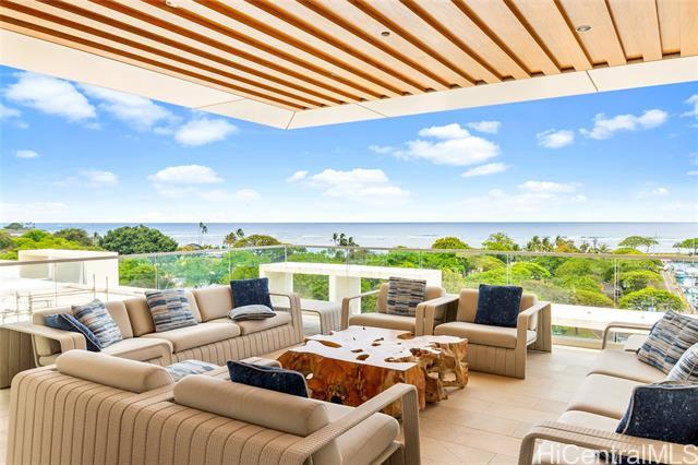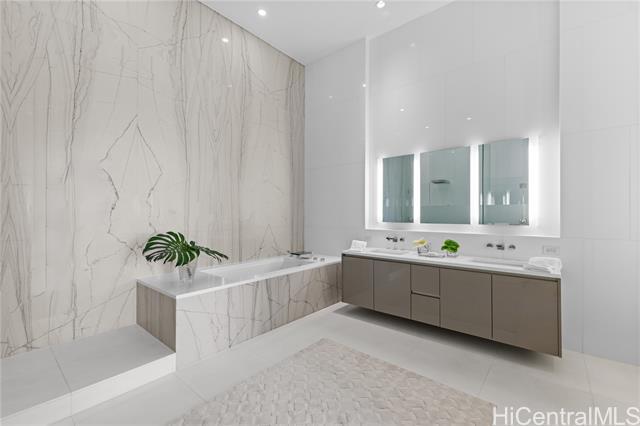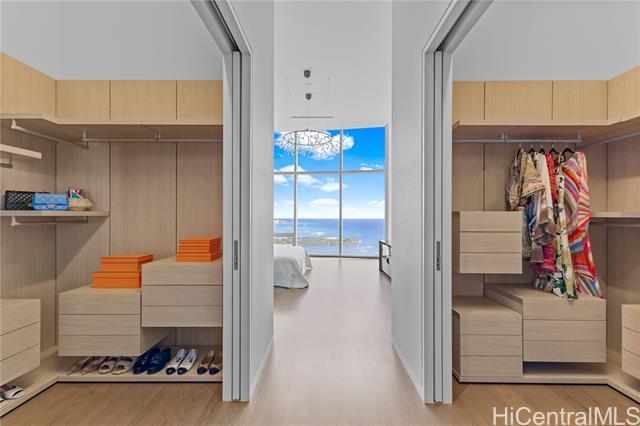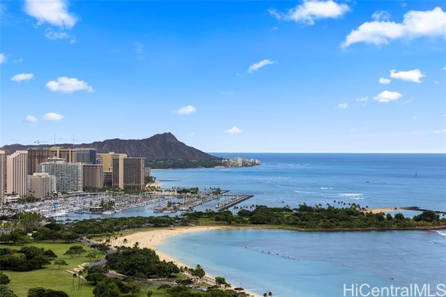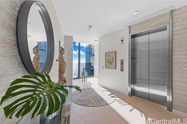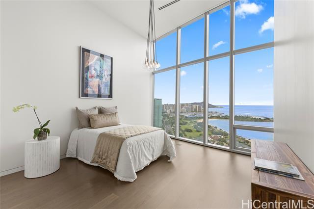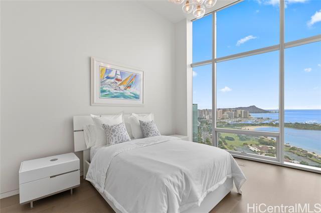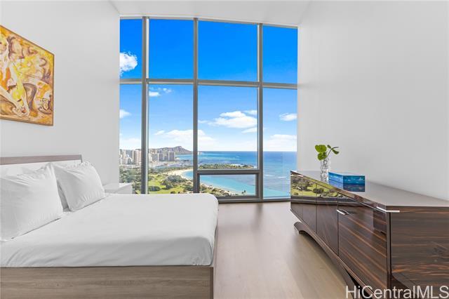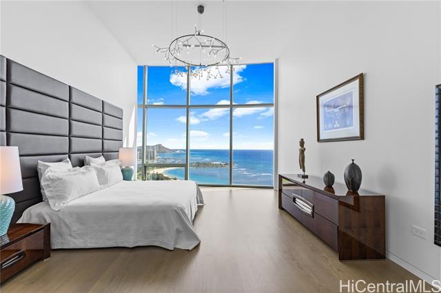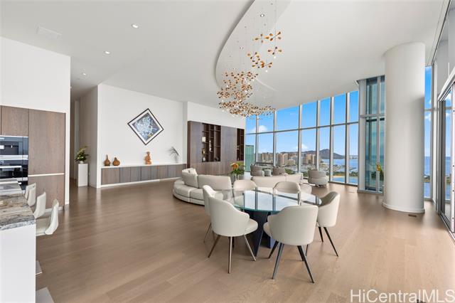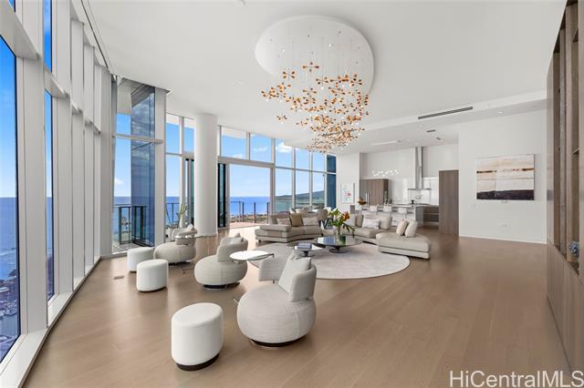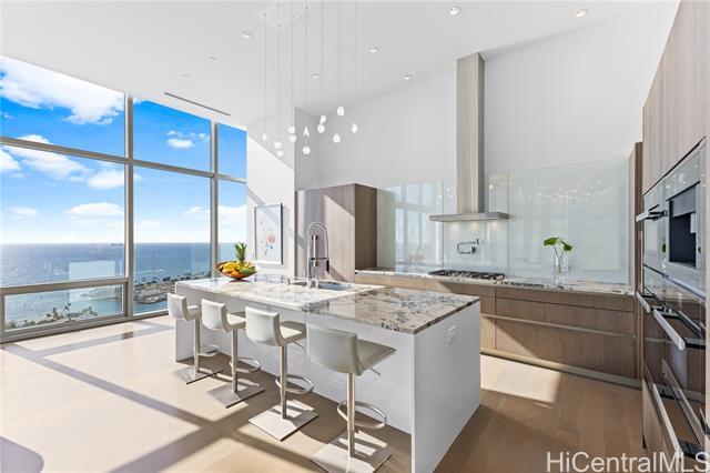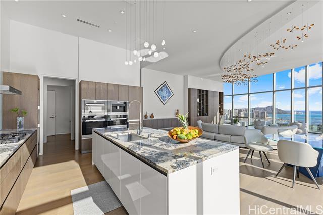 Exceptional offering in Ward Village. Waiea’s Penthouse 3400 commands a breathtaking position where the Pacific, the coastline, and sweeping views of Diamond Head span the horizon. A private elevator and foyer lead into soaring 13.5-ft ceilings and floor-to-ceiling glass framing ocean vistas, sailboats, and sunset skies. This 4,192-sf home features 4 bedrooms, plus a den and 4.5 baths with warm hardwoods, refined finishes, and soft contemporary design. The chef’s kitchen includes Miele appliances, premium European cabinetry, marble countertops, gas cooking, and a wine refrigerator. Bedrooms serve as private retreats with ensuite, spa-inspired baths highlighted by select marble and an onyx feature wall in the primary suite. A private lanai overlooks Magic Island, Ala Moana Beach, and Honolulu’s cityscape. Waiea offers world-class amenities including an ocean-view infinity pool, hot tub, fitness center, theater, dining rooms, BBQ pavilions, guest suites, and concierge services. A rare opportunity to experience penthouse living in Ward Village.