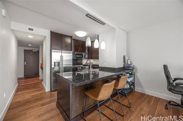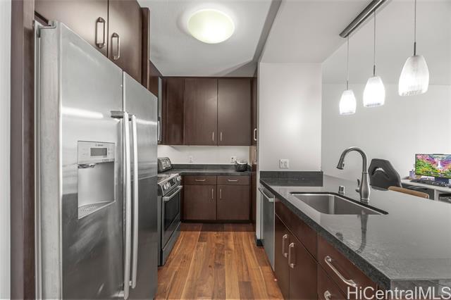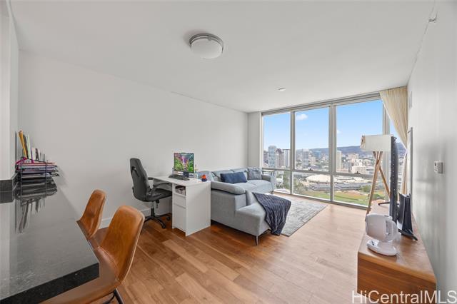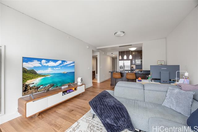 Experience the pinnacle of urban living in this rarely available high-floor residence at Waihonua. Perched on the 40th floor, this sleek 1-bedroom, 1-bathroom home offers breathtaking, unobstructed vistas of the Honolulu skyline and the majestic Ko‘olau Mountains. The interior reflects modern elegance with floor-to-ceiling windows, rich hardwood flooring, and a gourmet kitchen featuring polished granite countertops and premium Bosch stainless steel appliances. Unlike many urban units, this residence offers the ultimate convenience: one dedicated parking stall and a private storage locker. Resort-Style Amenities Living at Waihonua means access to a private club-style environment. The 6th-floor recreation deck is your personal playground, featuring.